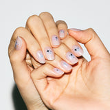 ふんわりとロマンチックなチークネイル。透明感のあるスキントーンの中央に入れたホワイトのチークに、ほのかに広がるパープルのベルベットパウダーとグリッター。オーロラとシルバーの箔がチラチラときらめき、まるで妖精が降りかける星の粉のようなファンタジックな世界をつくり上げます。