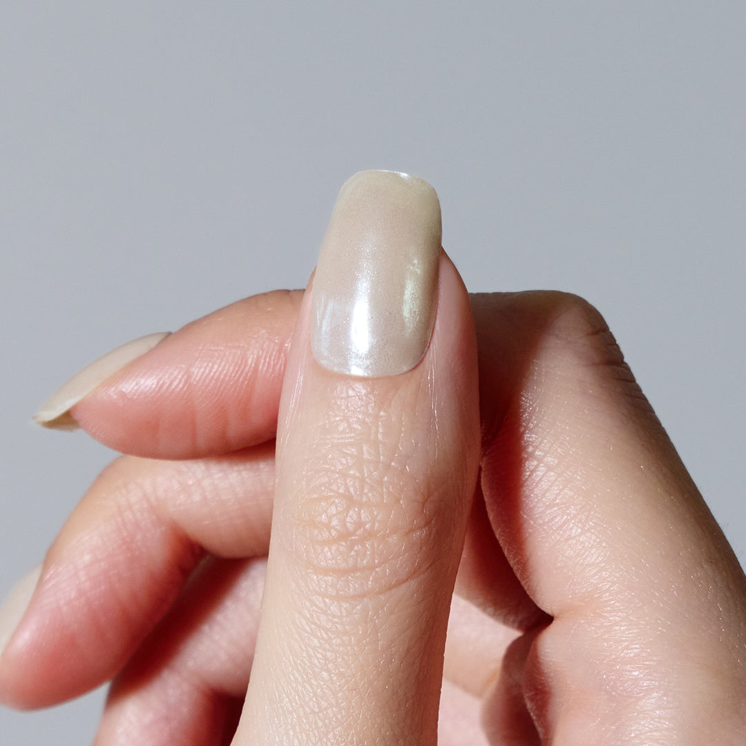 ホワイトのミラーパウダーを繊細に重ねることで生まれる、透明感あふれる光沢感。真珠のように光の反射で輝きを変化させ、シルクのヴェールのようななめらかでグロッシーな質感で、指先をやさしく包みます。シンプルさの中に際立つ高級感。さりげない上品さを漂わせ、オフィスからパーティーまで、どんなシーンでも指先の魅力を引き立てます。