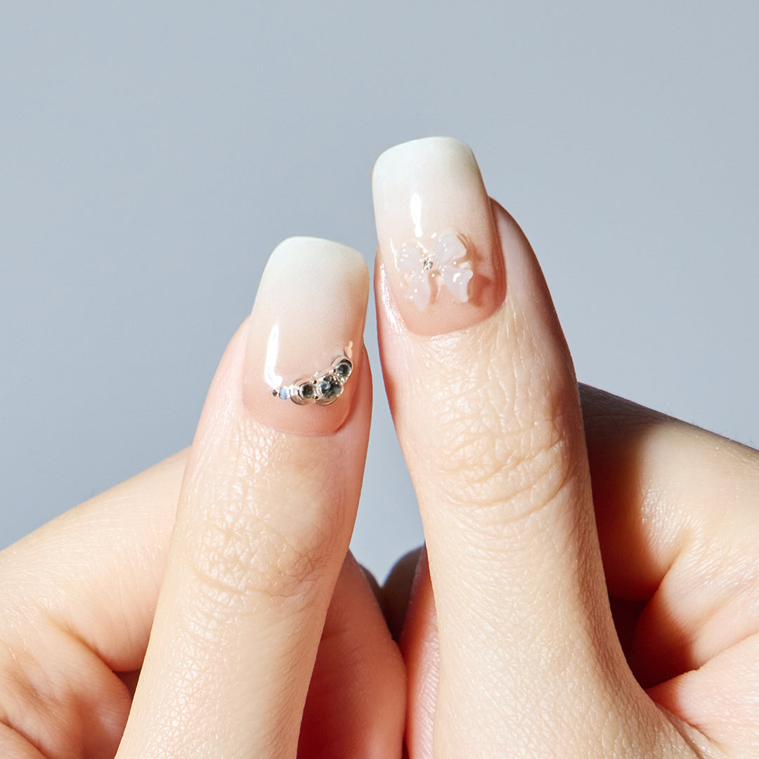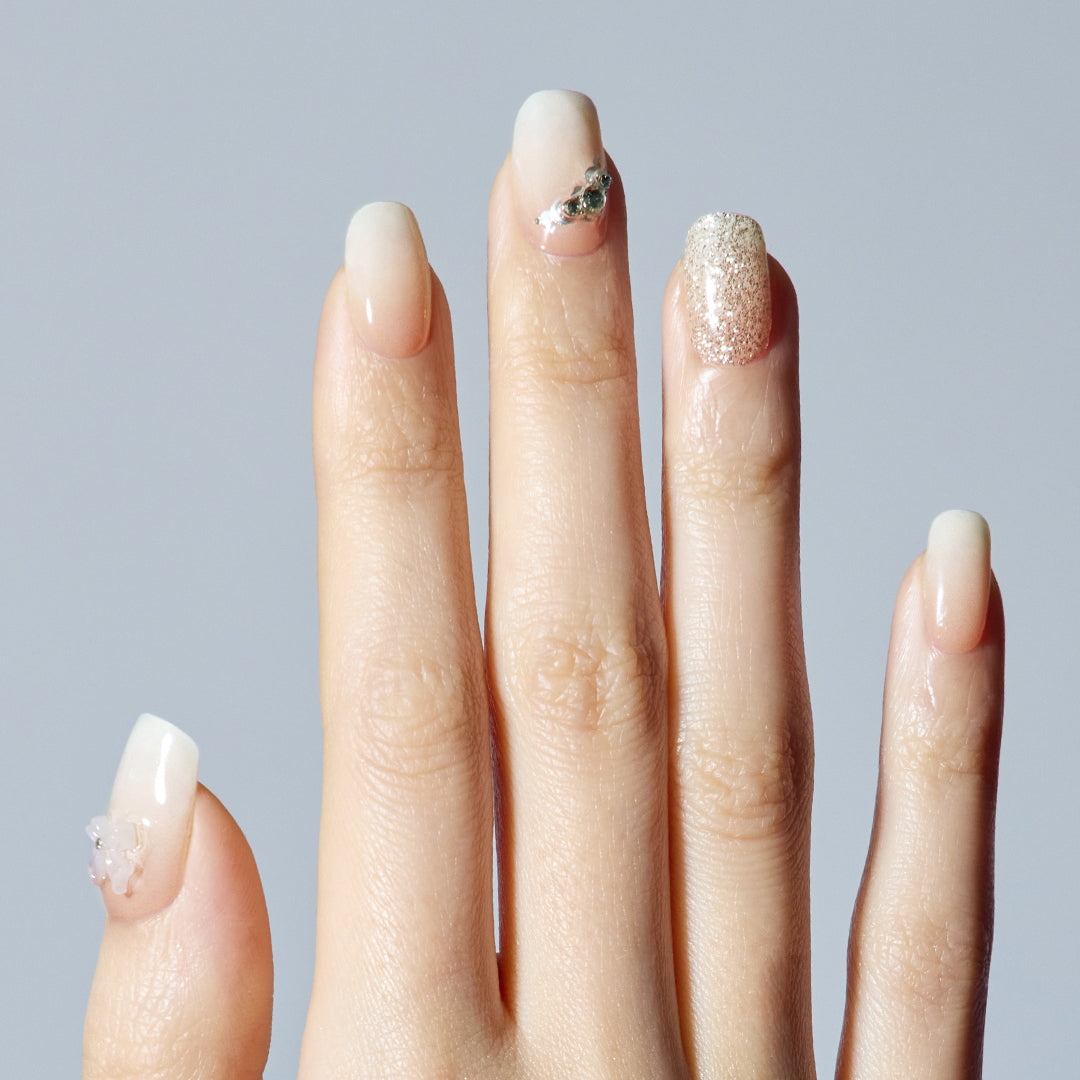 やわらかなホワイトのグラデーションに、ほのかに光沢感がにじむ、やさしさと温かみを感じさせるデザイン。シルバーグリッターとクリスタルストーンが可憐にきらめき、ホワイトのリボンパーツがフェミニンなアクセントとなって視線を集めます。ミルキーな色合いが奏でるエレガントなハーモニーが、ピュアで華やかな手もとを演出。おしゃれ心を高め日々を輝かせます。