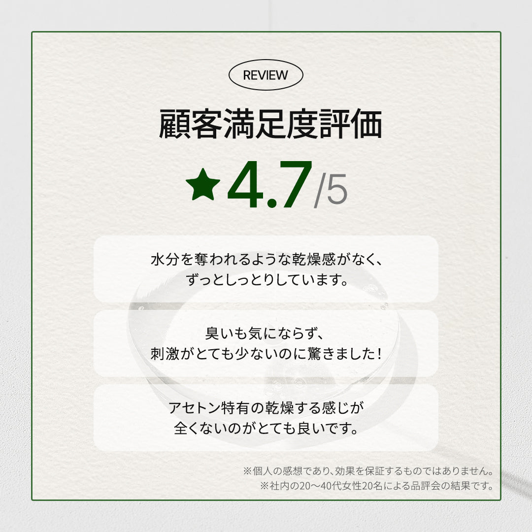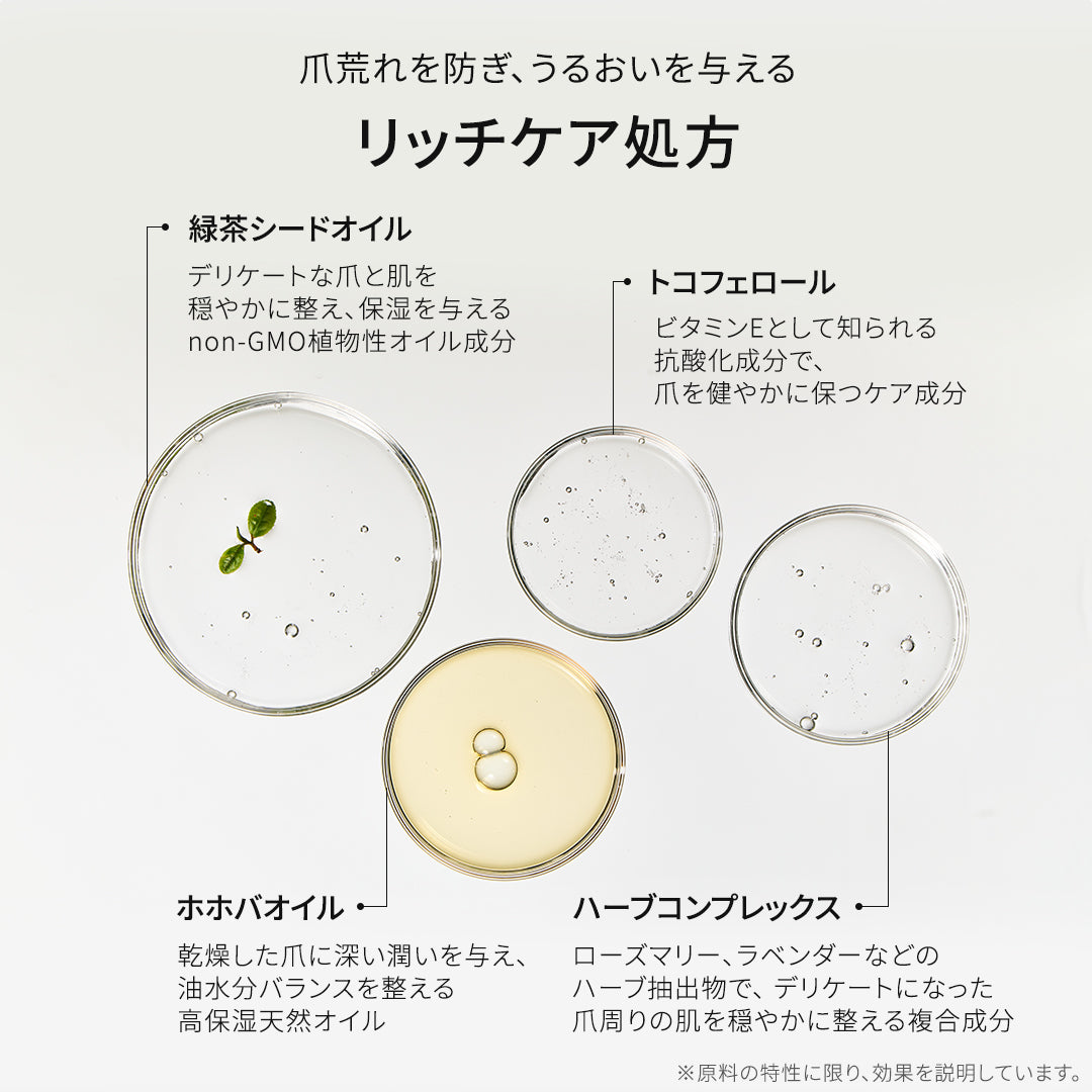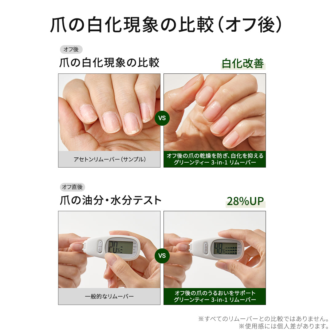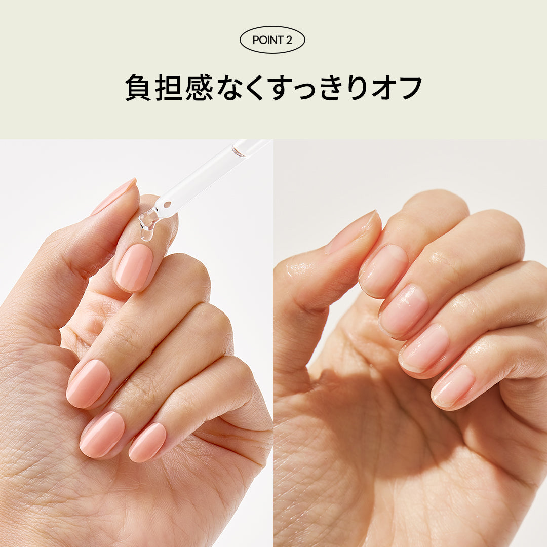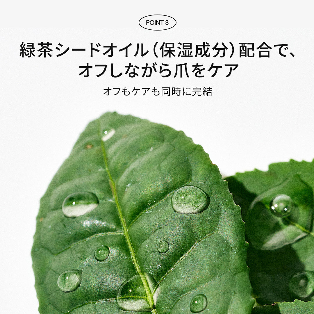 乾燥から爪を守り、やさしくネイルオフ。緑茶シードオイルなどの保湿成分を配合することで、オフ後の爪にうるおいを与え、乾燥を防ぎます。