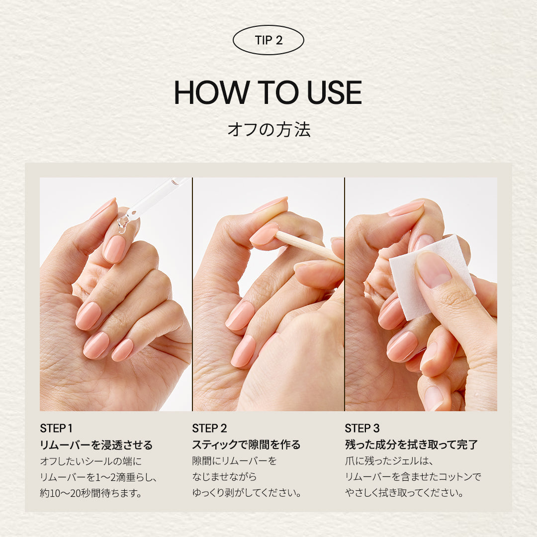 シールタイプ、チップタイプのすべてのジェルネイルに対応するマルチユースリムーバー。穏やかにオフし、うるおいを与え、しっとりとした指先で、ネイルチェンジを楽しめます。