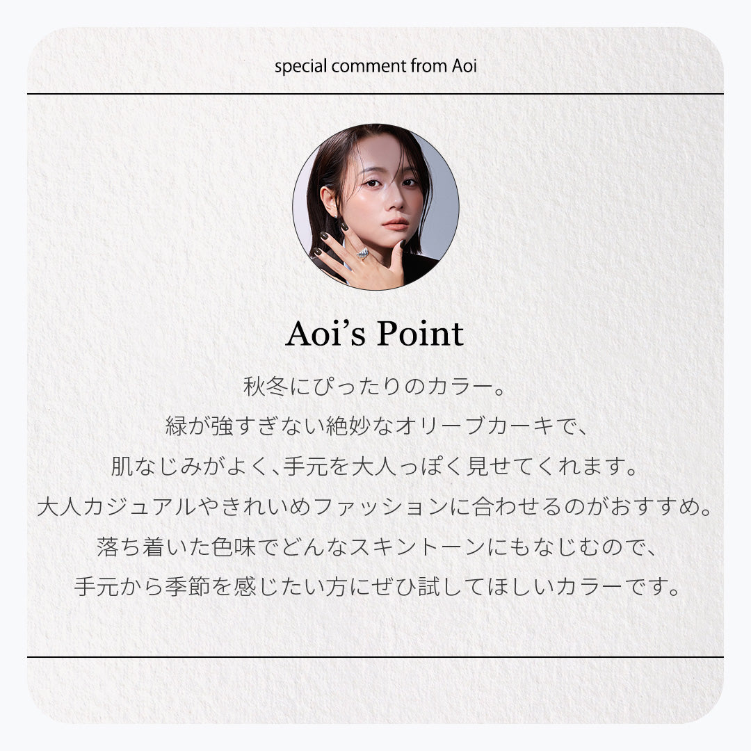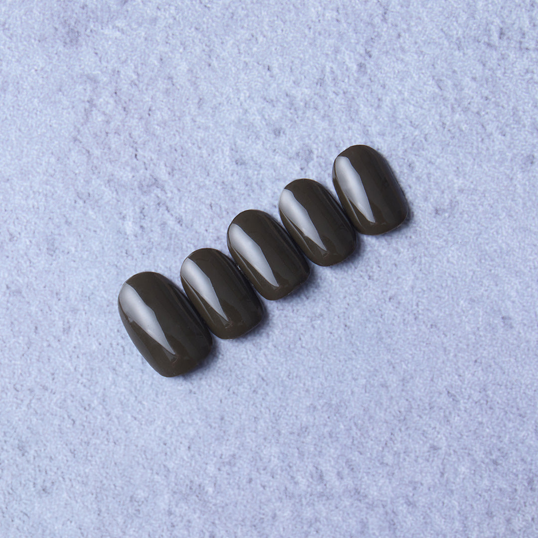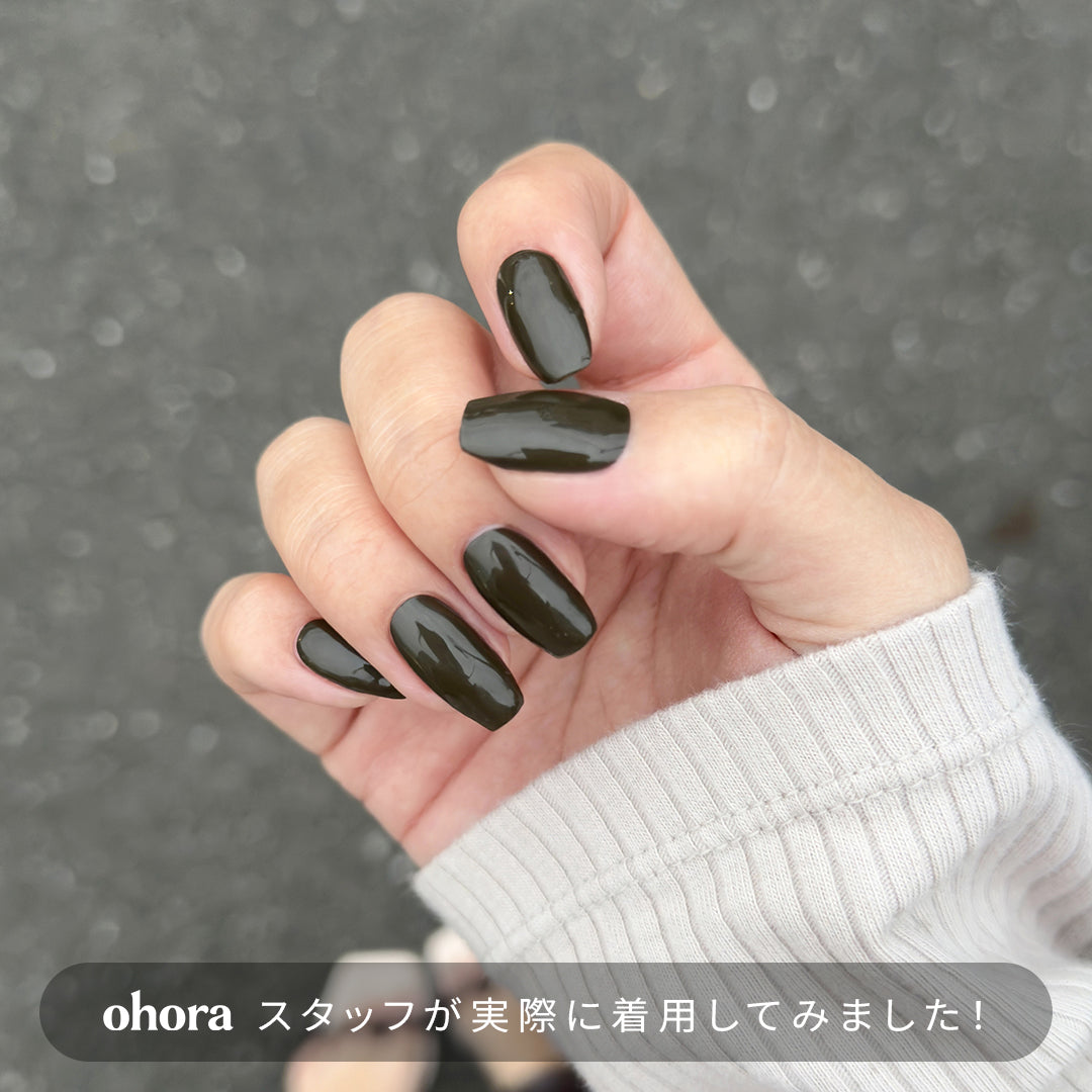 深く落ち着いた色合いが、手元に洗練されたムードを添えるワンカラーデザインです。ディープカーキブラウンのニュアンスが、どんなスタイルにも馴染みつつ、上品な存在感を放ちます。艶やかでグロッシーな光沢感が、シンプルでありながらも上質な雰囲気を演出し、指先をより美しく見せてくれます。日常に溶け込むリラックス感と、都会的なセンスを両立させたデザイン。カジュアルなデイリースタイルにはもちろん、フォーマルなシーンでもさりげなく洗練されたアクセントになります。どんな時も自信を与えてくれる、大人のための定番カラーです。