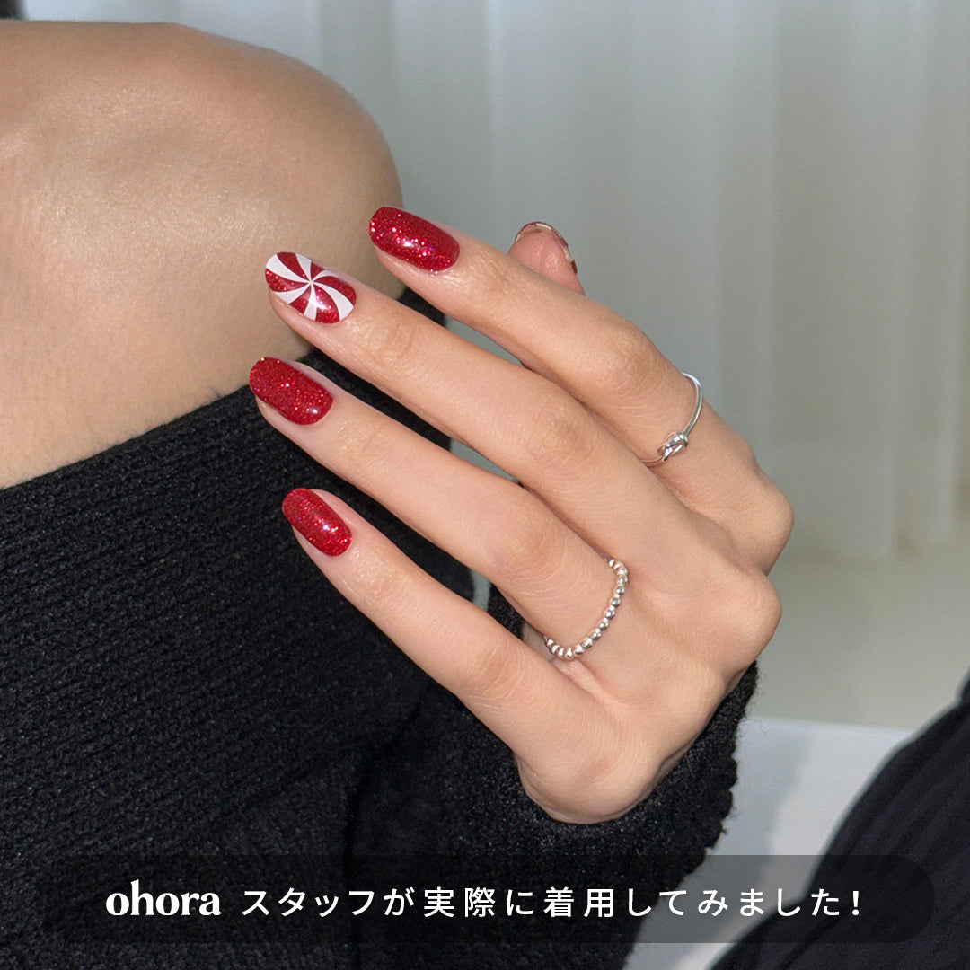 心ときめく甘いキャンディ、キャンディケインがモチーフ。角度によって輝きを変える、レッド&オーロラカラーのグリッターが、特別な夜のきらめきを演出します。ホワイトの渦巻き模様は、ミント風味のキャンディのようにさわやかで愛らしく、指先にイキイキとした躍動感を生み出します。