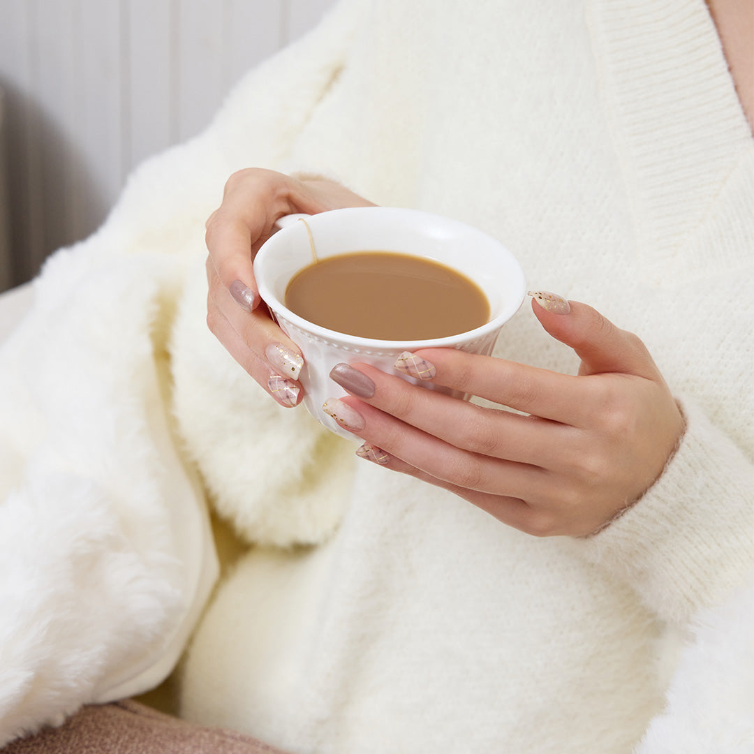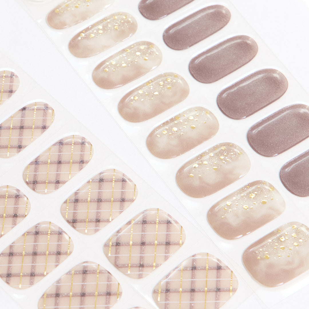 やわらかなローズブラウンを基調にしたクラシックなチェック柄に、マーブルのドローイングと繊細なグリッターの組み合わせ。光をやさしく含むように優雅にきらめき、ふんわりとした温もりのニュアンスが広がります。落ち着いたカラーと洗練されたパターンが絶妙に調和。どんな装いにも自然になじむ上品なデザインです。