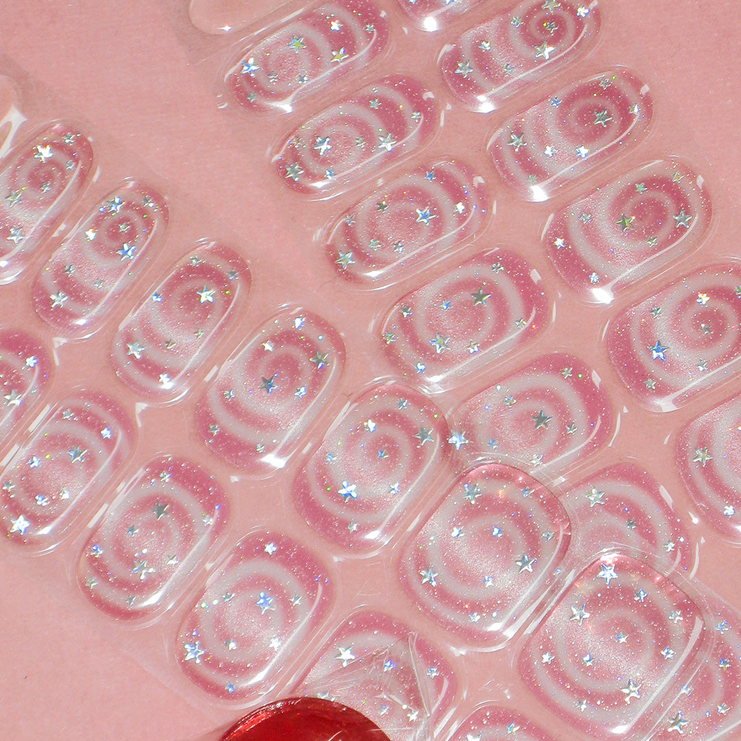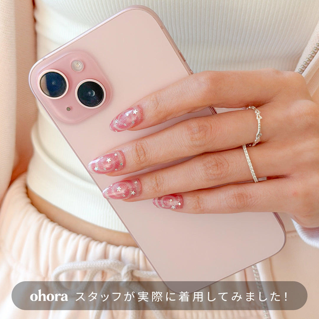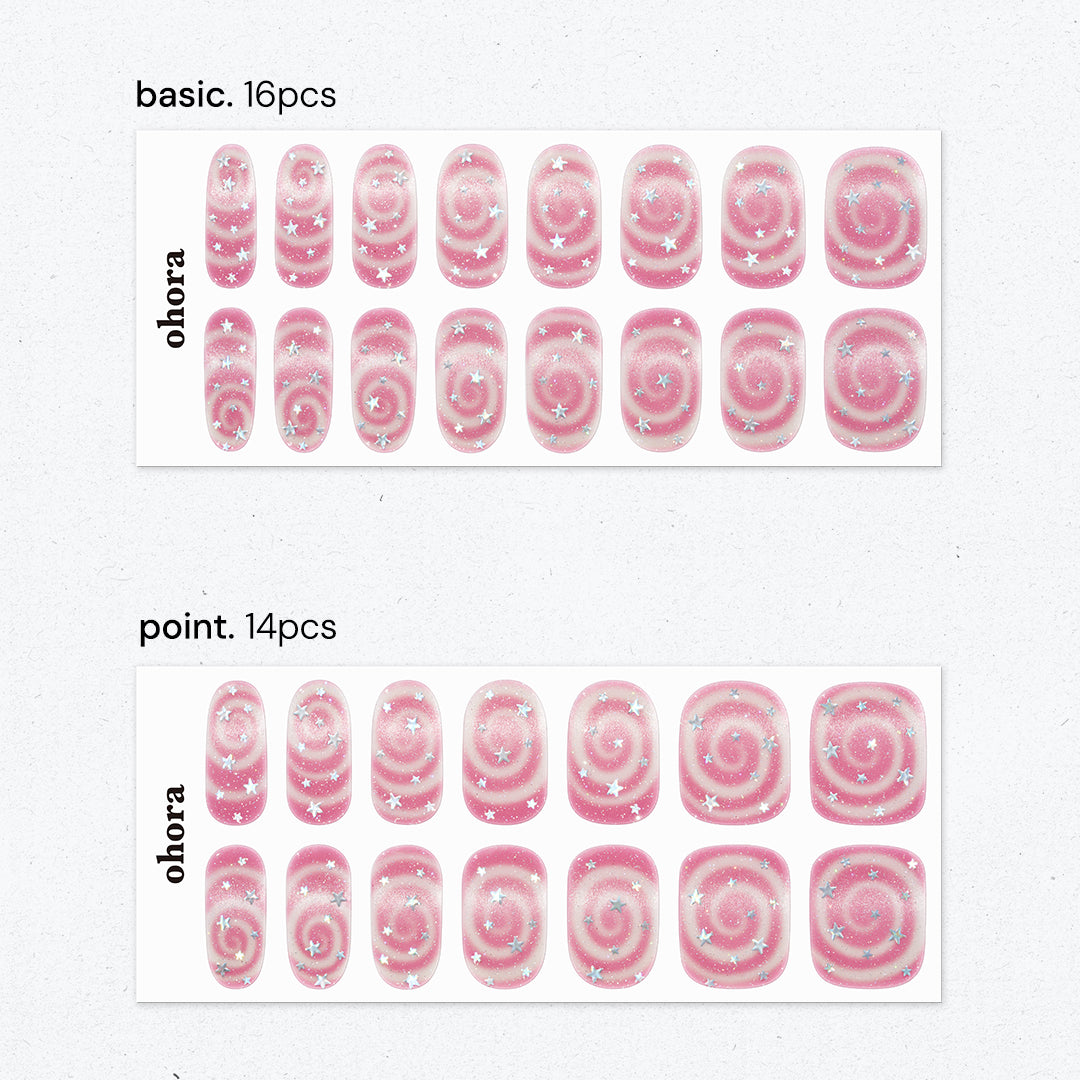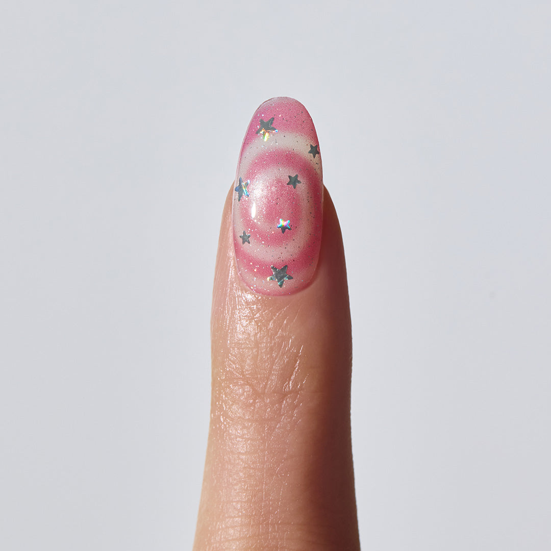 やわらかなピンクをベースに、くるくる渦巻きのスワールパターンと星のきらめきをプラス。まるでギフトボックスのリボンのように、指先に甘さが溶け込み、軽やかな動きとやさしい雰囲気をつくり出します。角度によってほのかに色や輝きが変化。見つめているだけでロマンチックな世界に誘われます。