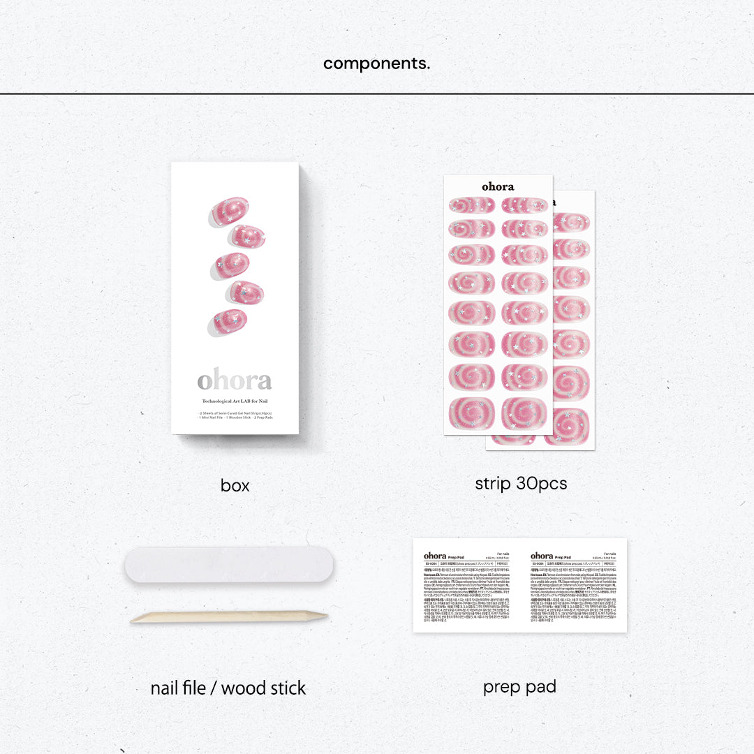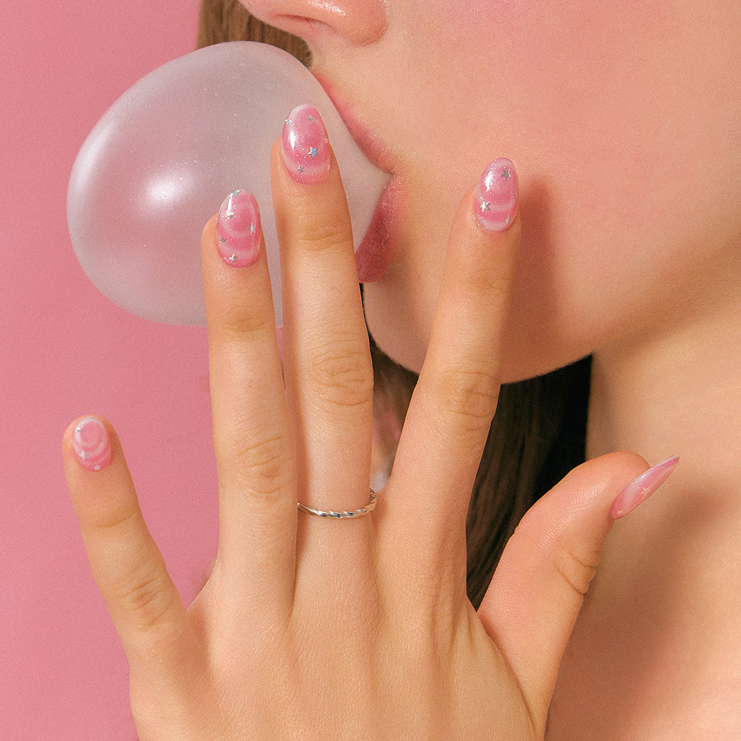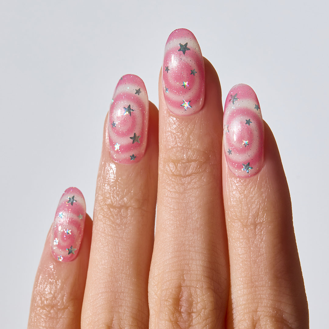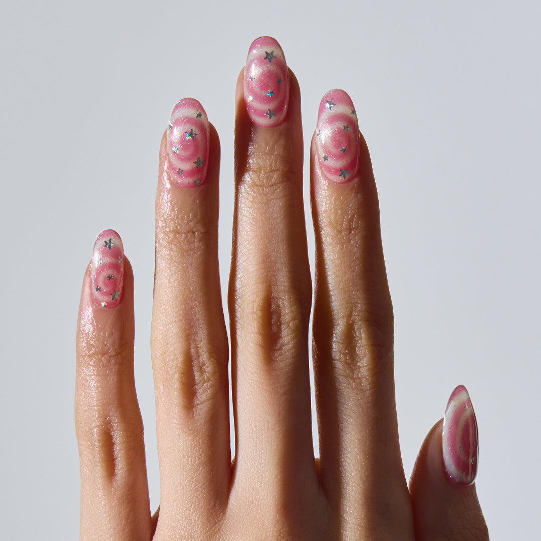 やわらかなピンクをベースに、くるくる渦巻きのスワールパターンと星のきらめきをプラス。まるでギフトボックスのリボンのように、指先に甘さが溶け込み、軽やかな動きとやさしい雰囲気をつくり出します。角度によってほのかに色や輝きが変化。見つめているだけでロマンチックな世界に誘われます。
