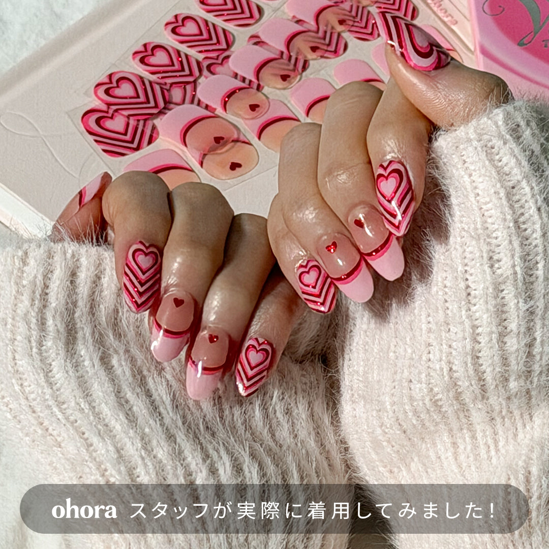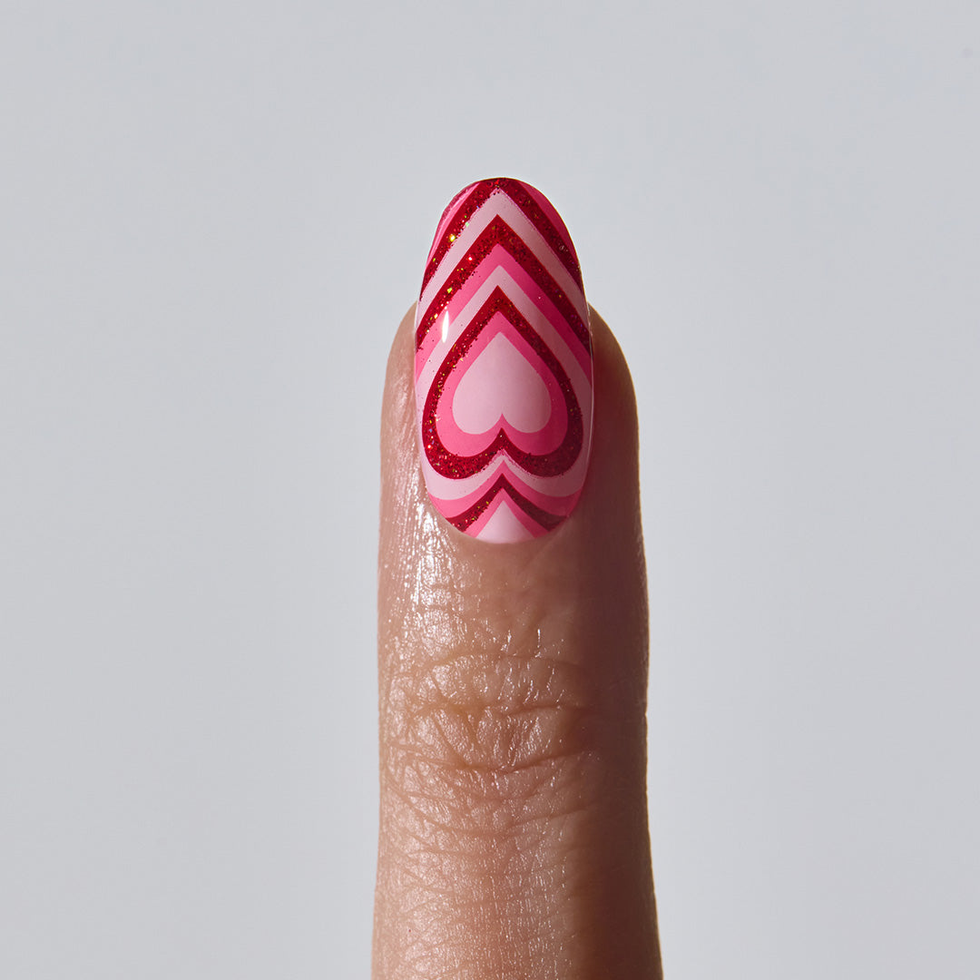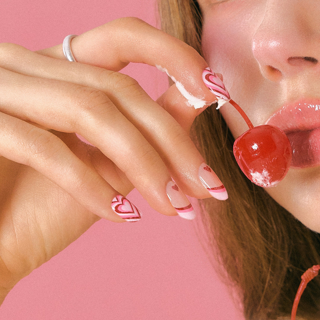 ピンク×赤のカラーリングに、ハートモチーフの組み合わせは無敵。指先をバブルガムで包み込んだように、甘さと楽しさ、そしてキッチュな魅力がエネルギーとなって弾けます。陽気さを感じさせながらも、主張しすぎない絶妙なバランス。ふとしたしぐさにも愛らしさを感じさせ、気分の上がるネイルです。