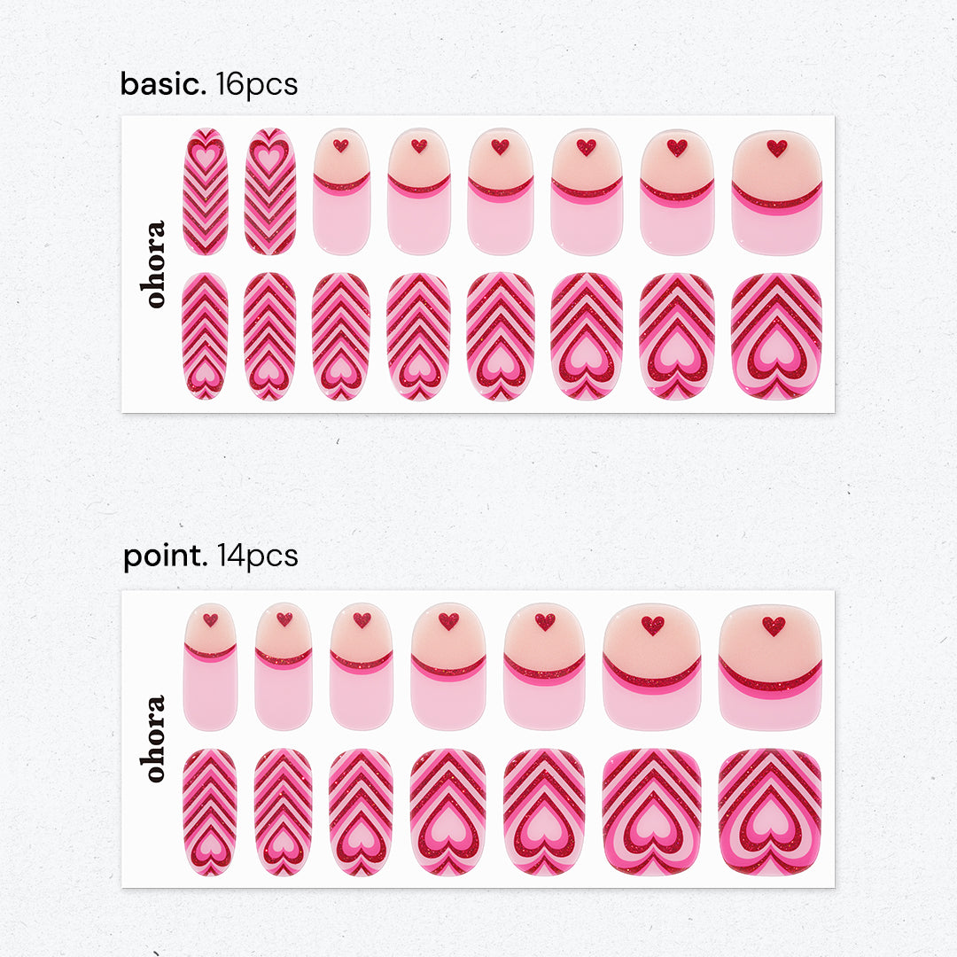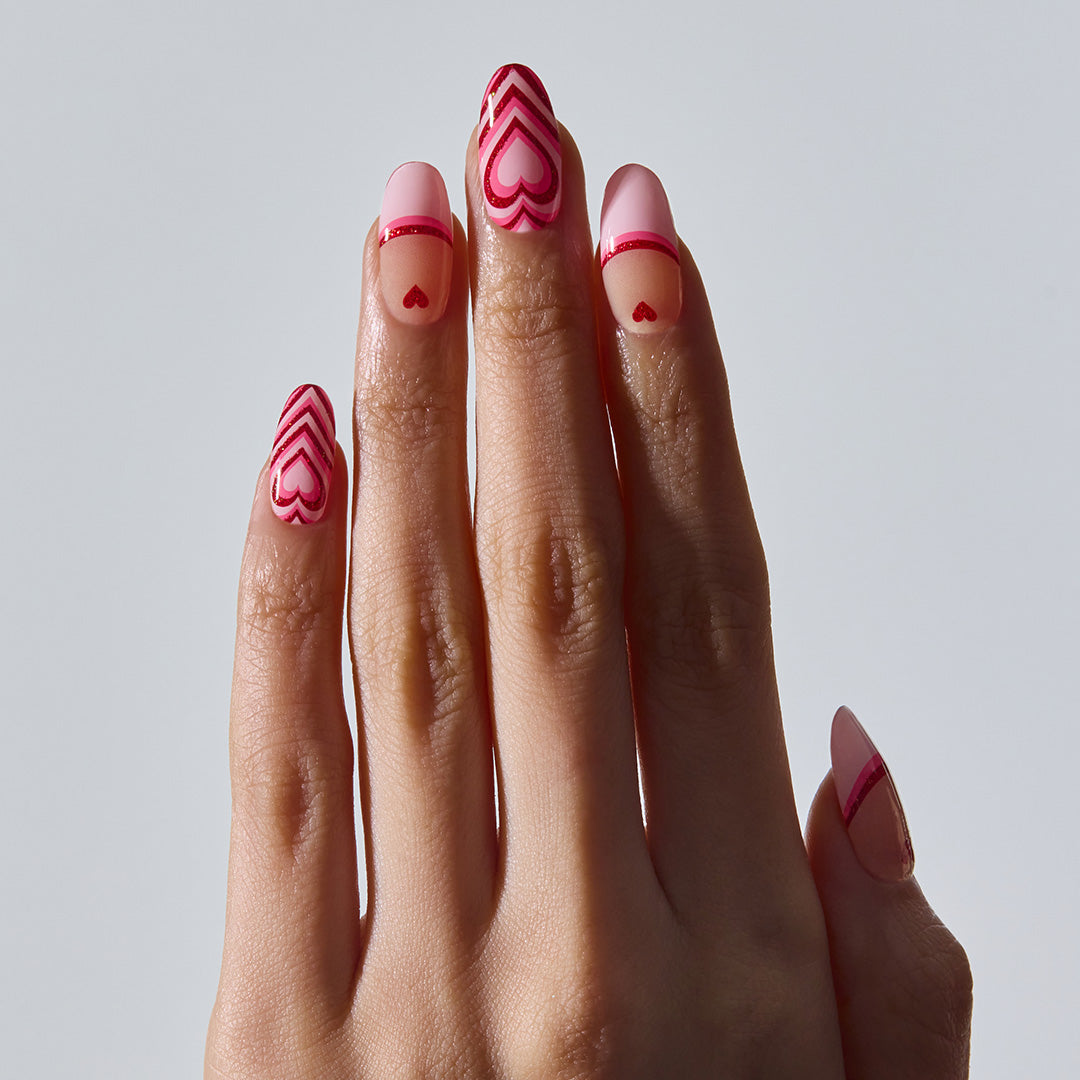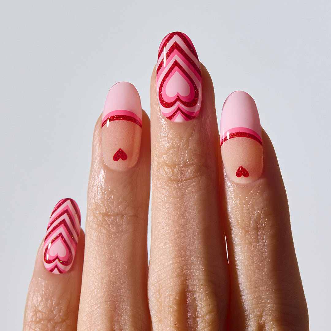 ピンク×赤のカラーリングに、ハートモチーフの組み合わせは無敵。指先をバブルガムで包み込んだように、甘さと楽しさ、そしてキッチュな魅力がエネルギーとなって弾けます。陽気さを感じさせながらも、主張しすぎない絶妙なバランス。ふとしたしぐさにも愛らしさを感じさせ、気分の上がるネイルです。