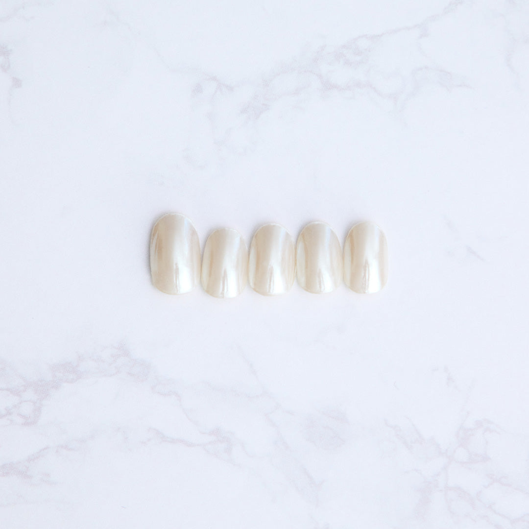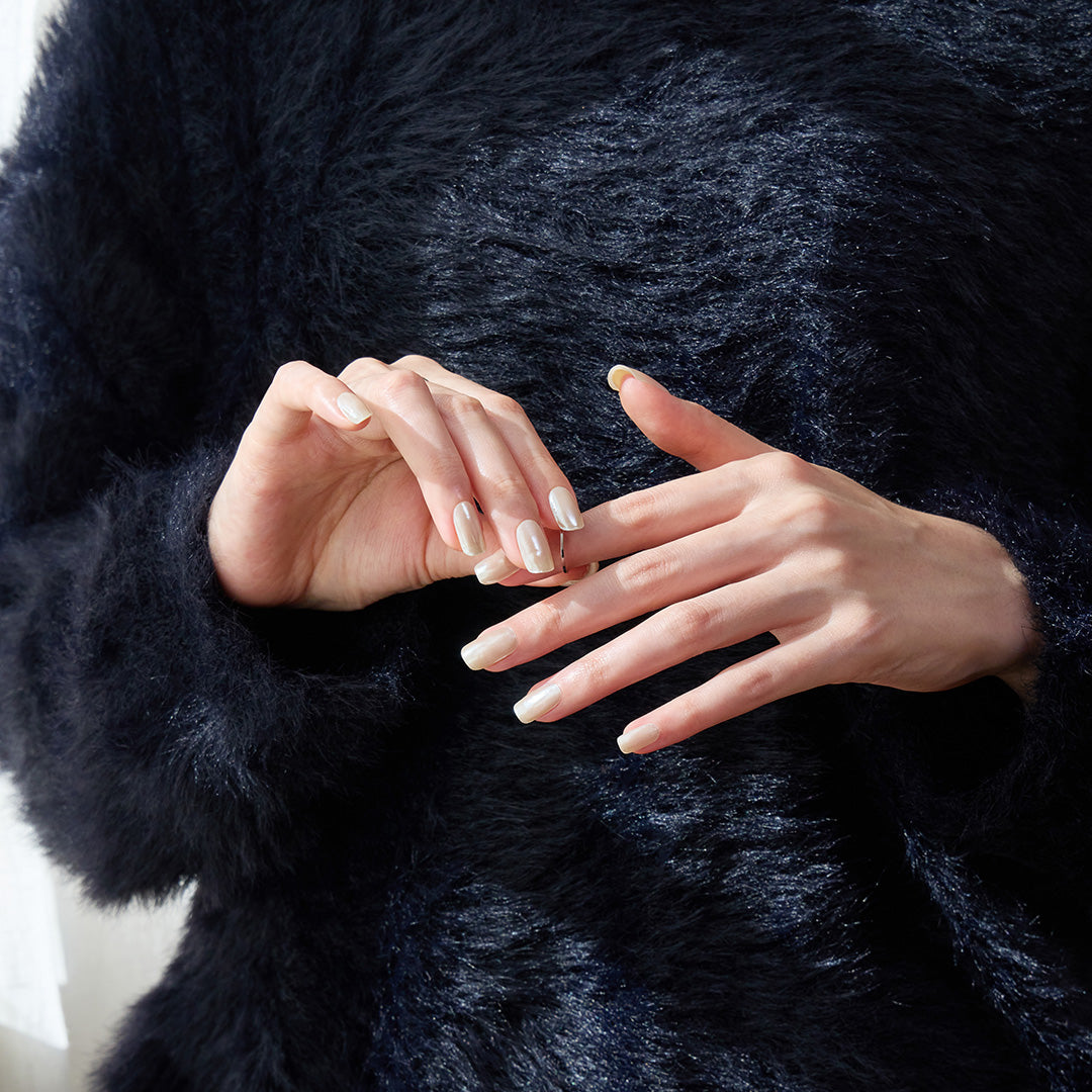ホワイトのミラーパウダーを繊細に重ねることで生まれる、透明感あふれる光沢感。真珠のように光の反射で輝きを変化させ、シルクのヴェールのようななめらかでグロッシーな質感で、指先をやさしく包みます。シンプルさの中に際立つ高級感。さりげない上品さを漂わせ、オフィスからパーティーまで、どんなシーンでも指先の魅力を引き立てます。
