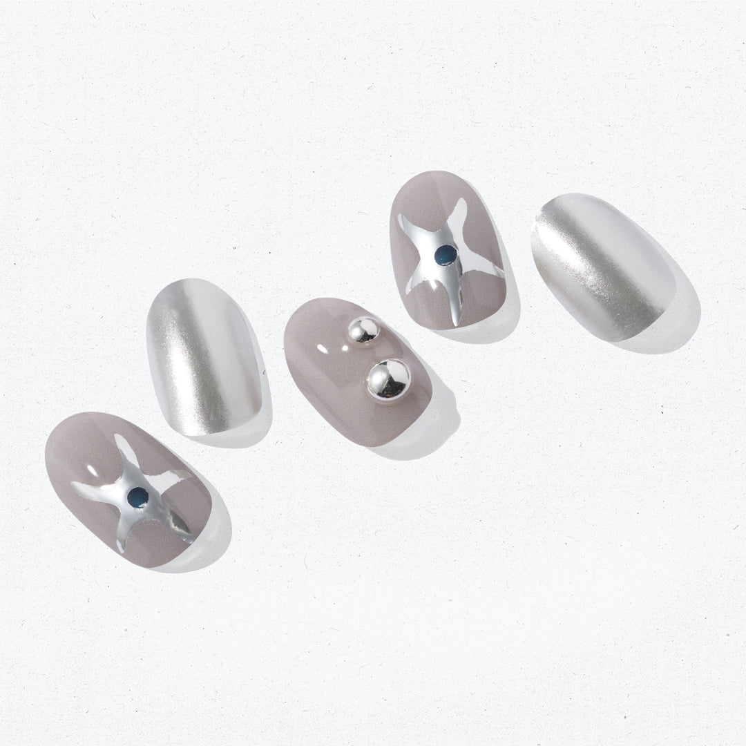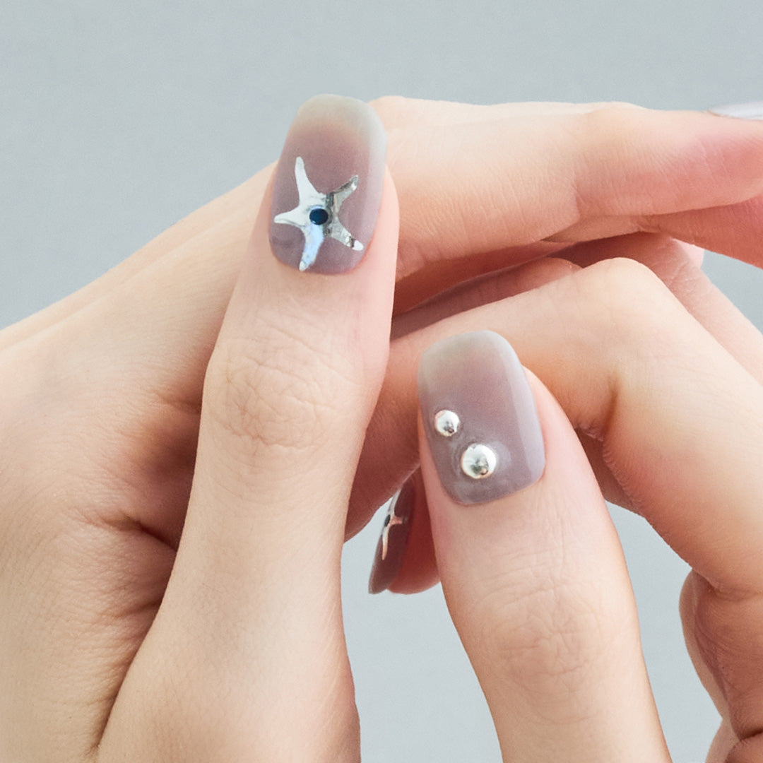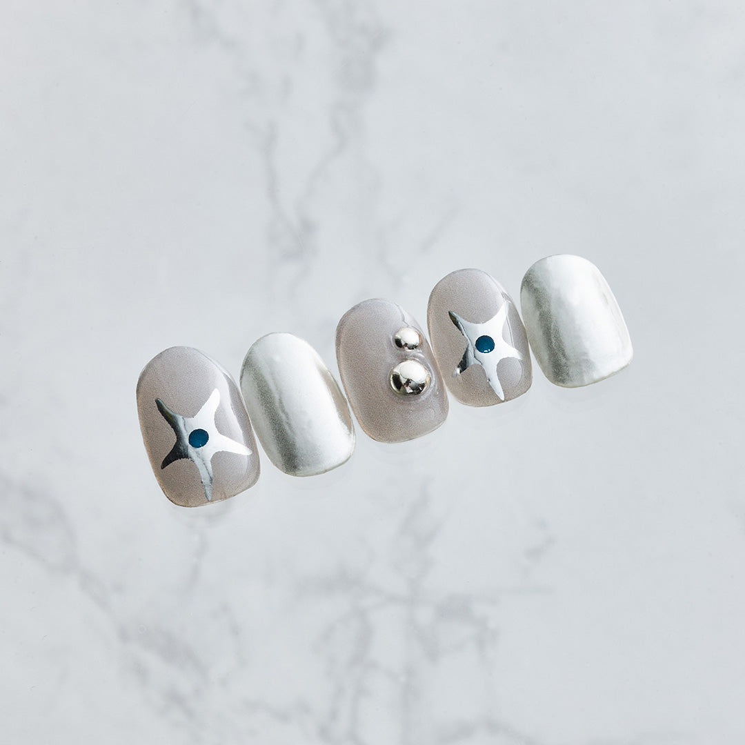なめらかに輝くシルバークロムカラーと、ほのかにライラックを帯びたグレーのシックカラーの組み合わせ。星のドローイングとクリスタルジェムストーンが光を受けるたびに立体的なきらめきを生み出します。メタリックな質感とグロッシーな仕上がりが調和し、モダンでユニセックスな魅力を際立たせるデザインです。