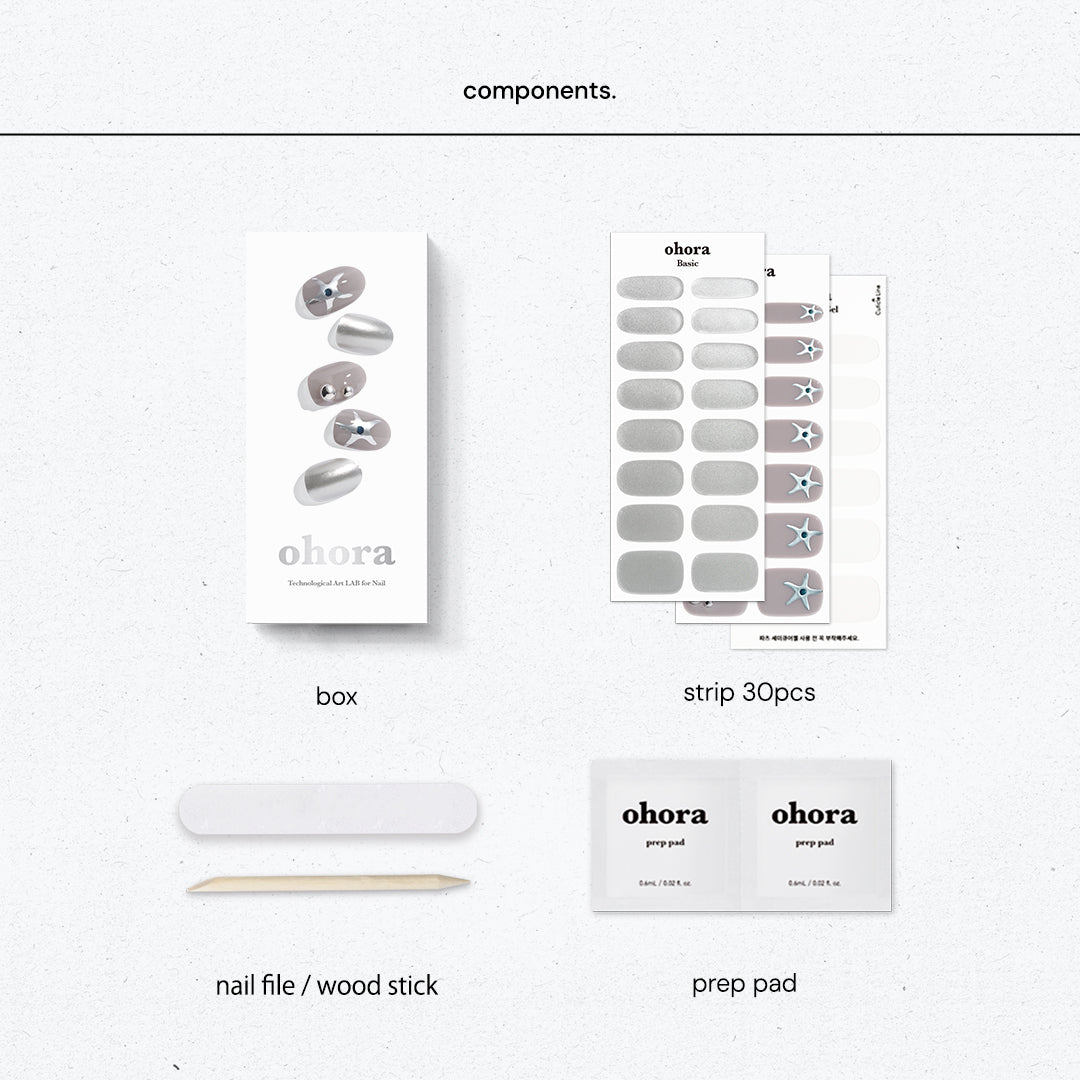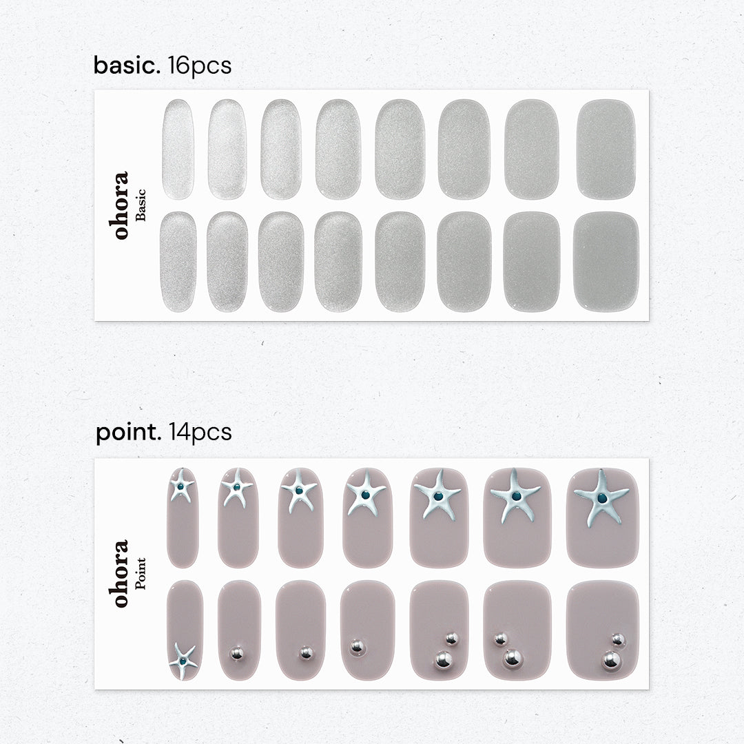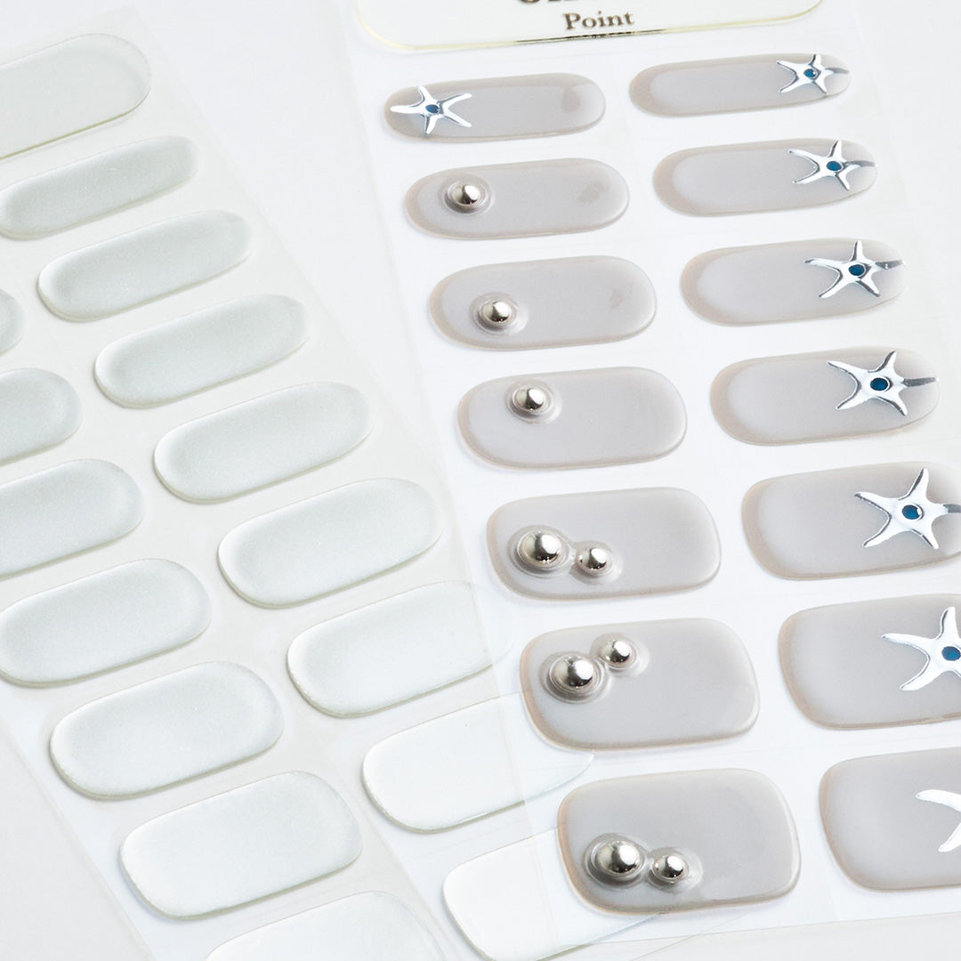 なめらかに輝くシルバークロムカラーと、ほのかにライラックを帯びたグレーのシックカラーの組み合わせ。星のドローイングとクリスタルジェムストーンが光を受けるたびに立体的なきらめきを生み出します。メタリックな質感とグロッシーな仕上がりが調和し、モダンでユニセックスな魅力を際立たせるデザインです。