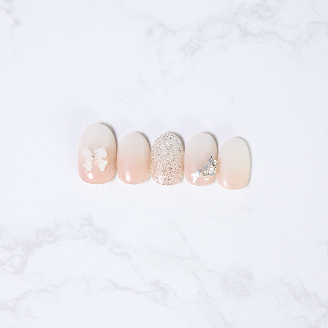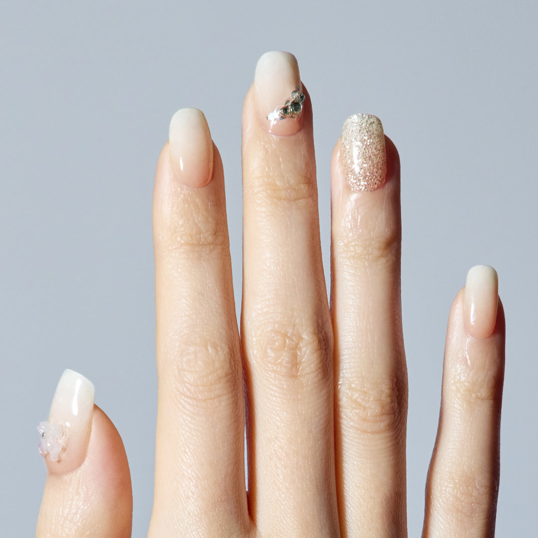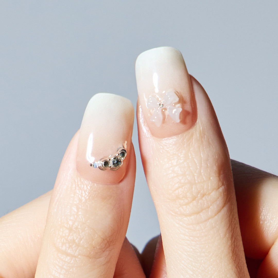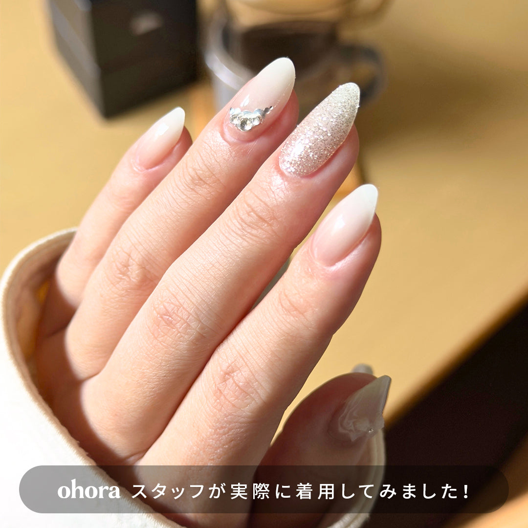 やわらかなホワイトのグラデーションに、ほのかに光沢感がにじむ、やさしさと温かみを感じさせるデザイン。シルバーグリッターとクリスタルストーンが可憐にきらめき、ホワイトのリボンパーツがフェミニンなアクセントとなって視線を集めます。ミルキーな色合いが奏でるエレガントなハーモニーが、ピュアで華やかな手もとを演出。おしゃれ心を高め日々を輝かせます。