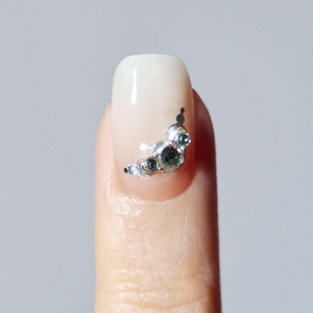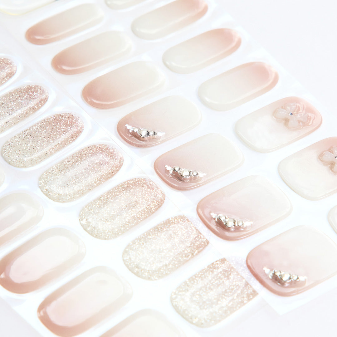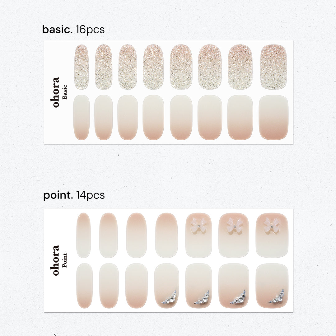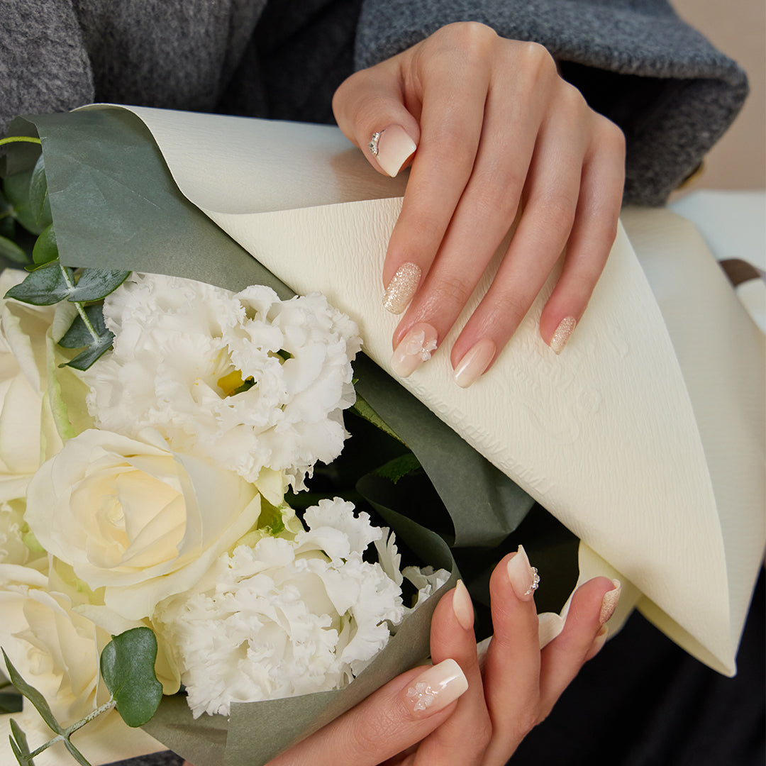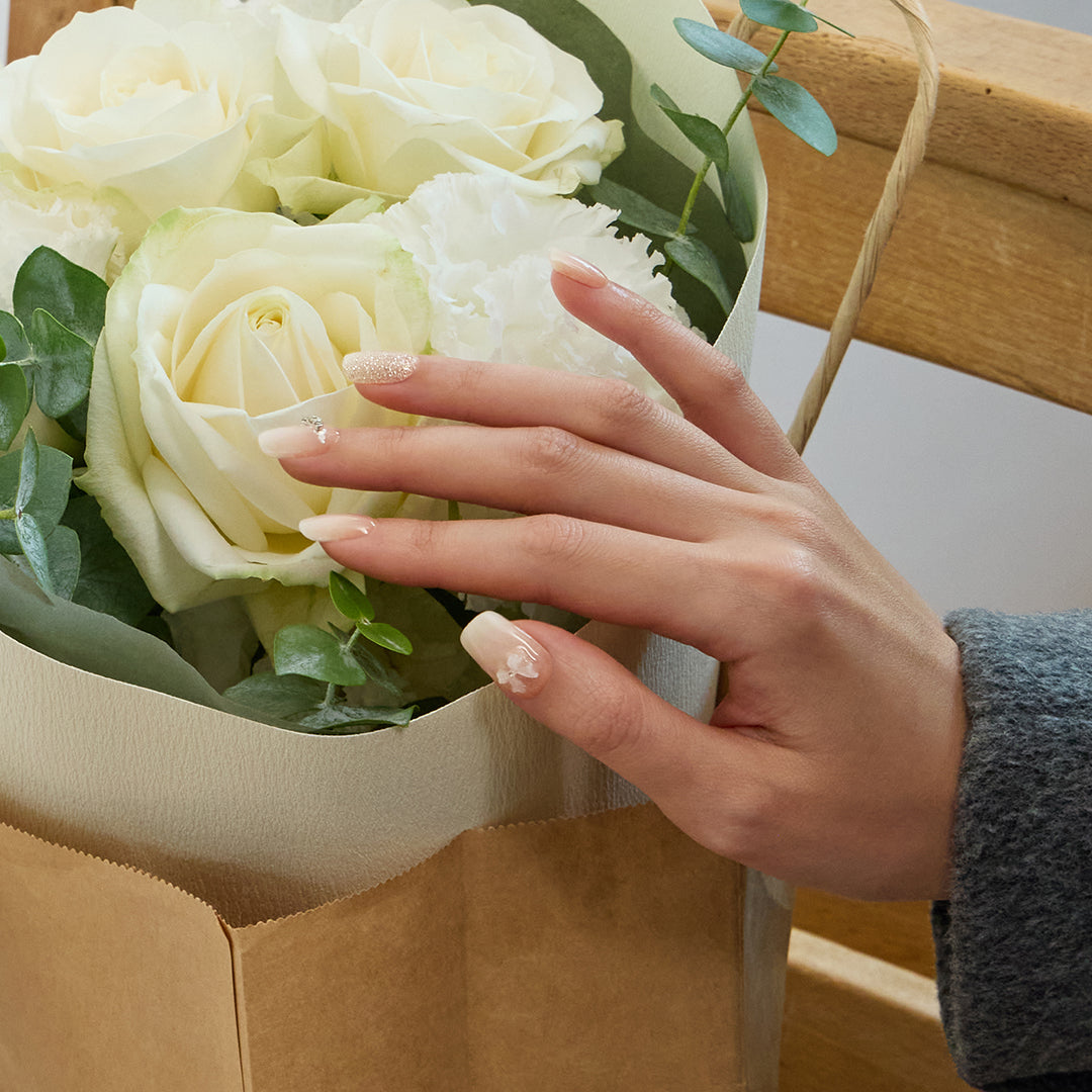 やわらかなホワイトのグラデーションに、ほのかに光沢感がにじむ、やさしさと温かみを感じさせるデザイン。シルバーグリッターとクリスタルストーンが可憐にきらめき、ホワイトのリボンパーツがフェミニンなアクセントとなって視線を集めます。ミルキーな色合いが奏でるエレガントなハーモニーが、ピュアで華やかな手もとを演出。おしゃれ心を高め日々を輝かせます。