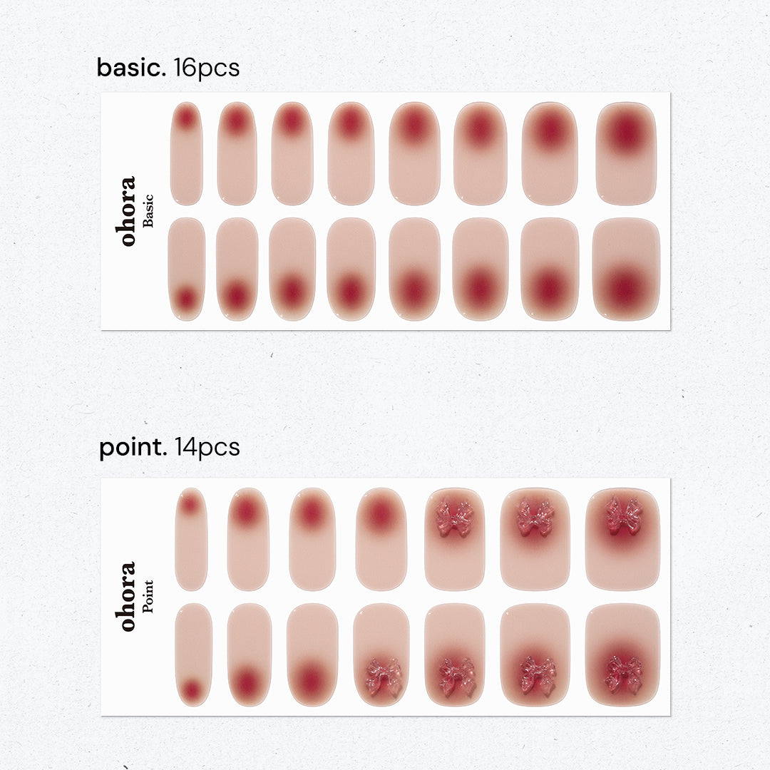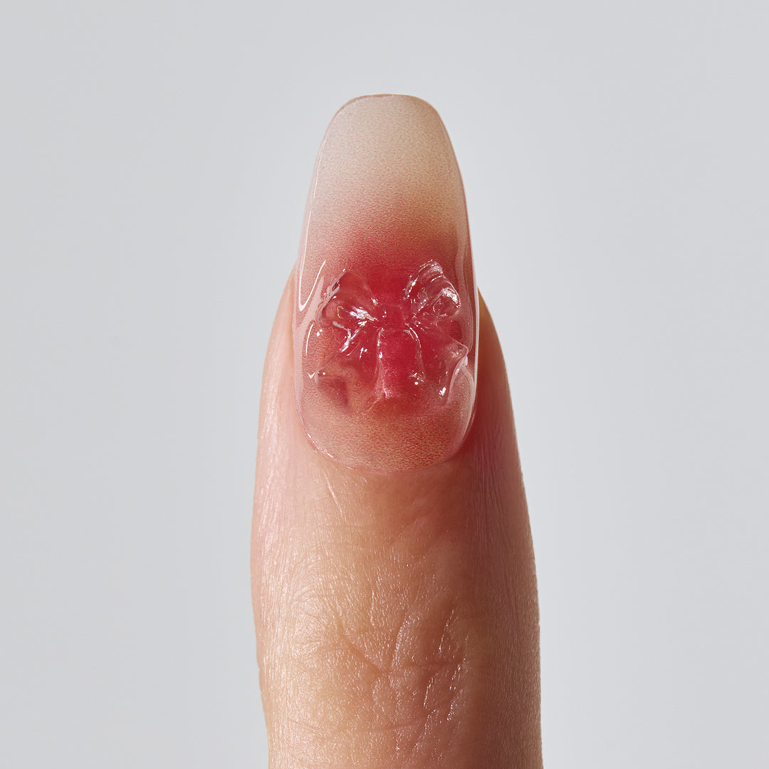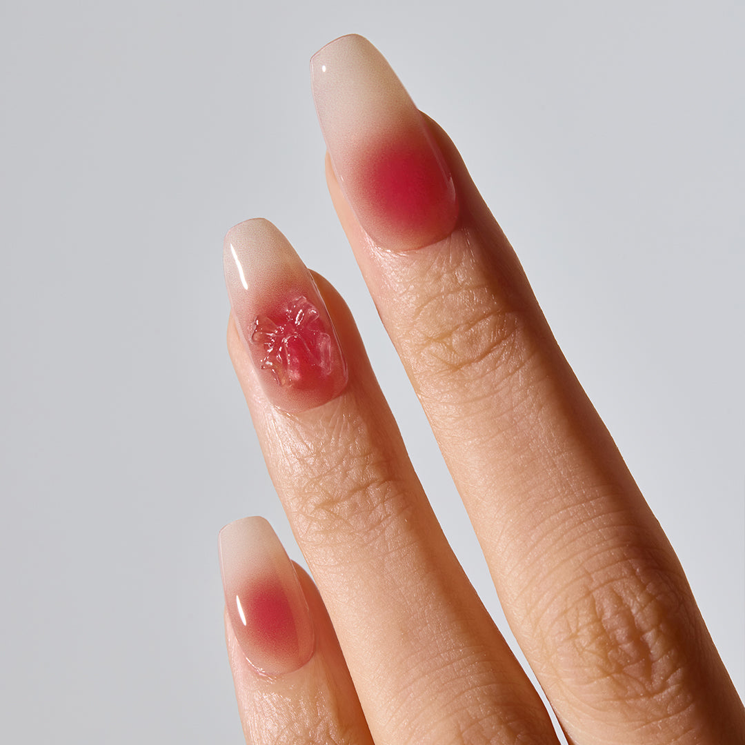 愛をささやく瞬間、はにかんで赤くなる頬をイメージしたローズピンクのチークグラデーション。ふんわりと広がるカラーの中に温かな光を宿し、ベースカラーをほんのり映した透明なリボンパーツが、秘めた恋心まで感じさせます。華やかでありながら落ち着きがあり、指先になじむカラー。デイリーにも使いやすいデザインです。
