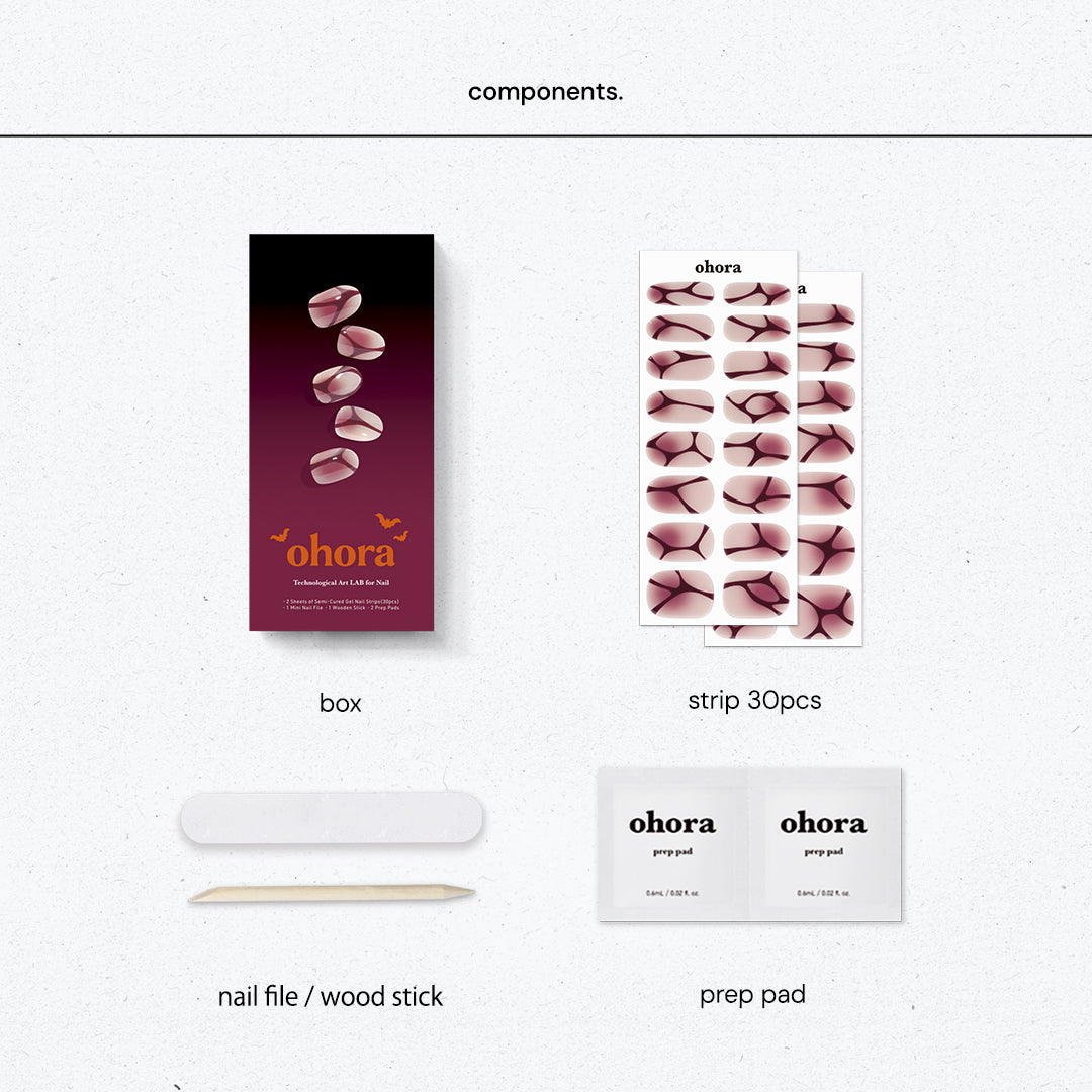 指先に一滴の血がにじみ出すように、赤が広がり、血管のように流れる優美なラインと調和。怖さと美しさが同居し、ミステリアスなニュアンスを伝えます。それぞれの爪で異なる方向に流れる曲線は、やわらかさの中に強いインパクトを与え、並べ方によっても表情が変わり、個性を際立たせます。