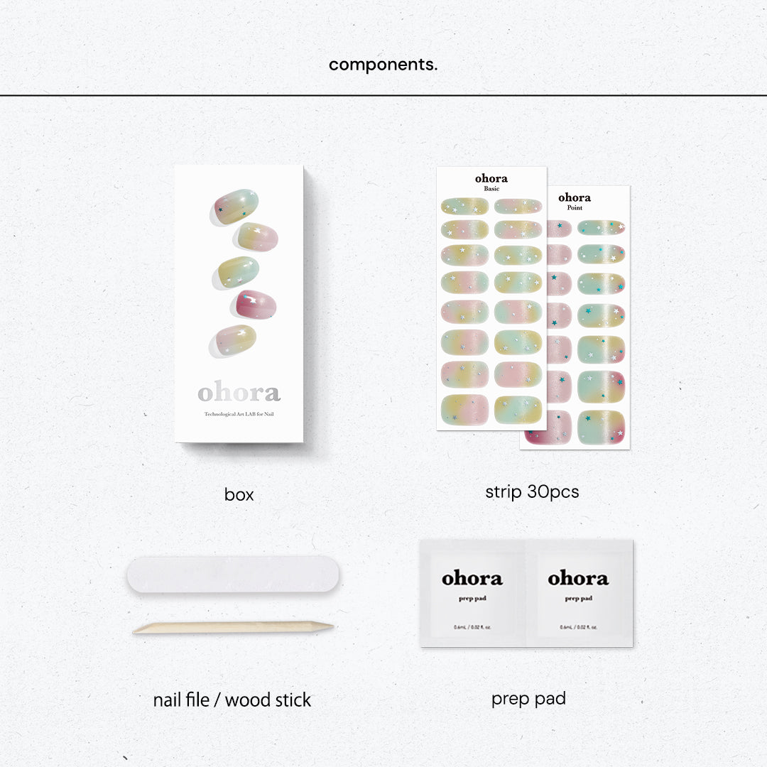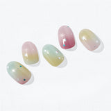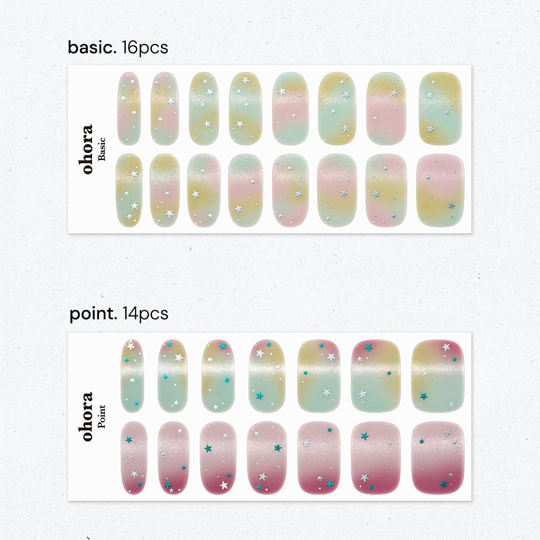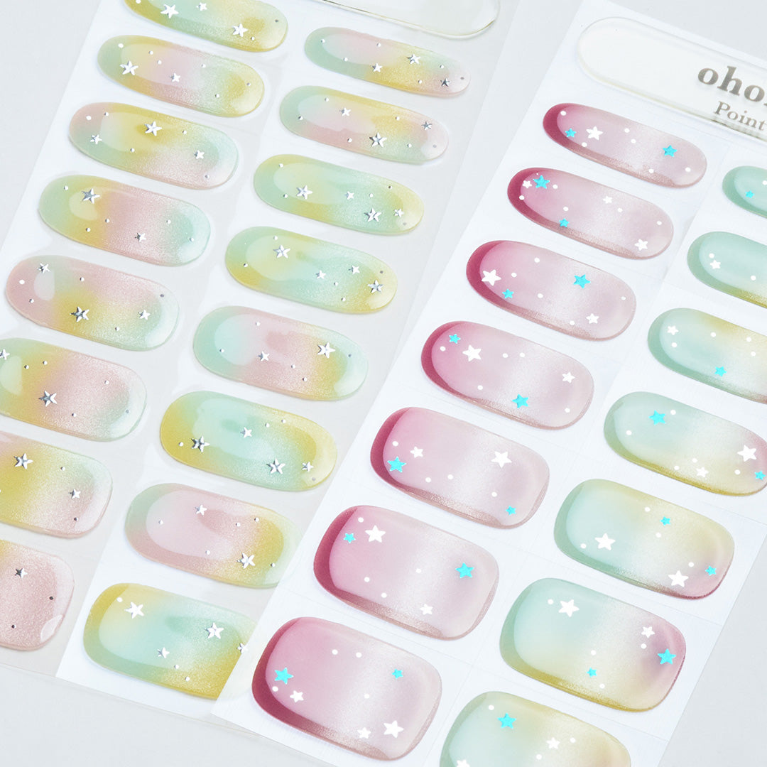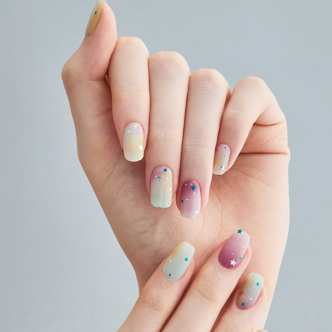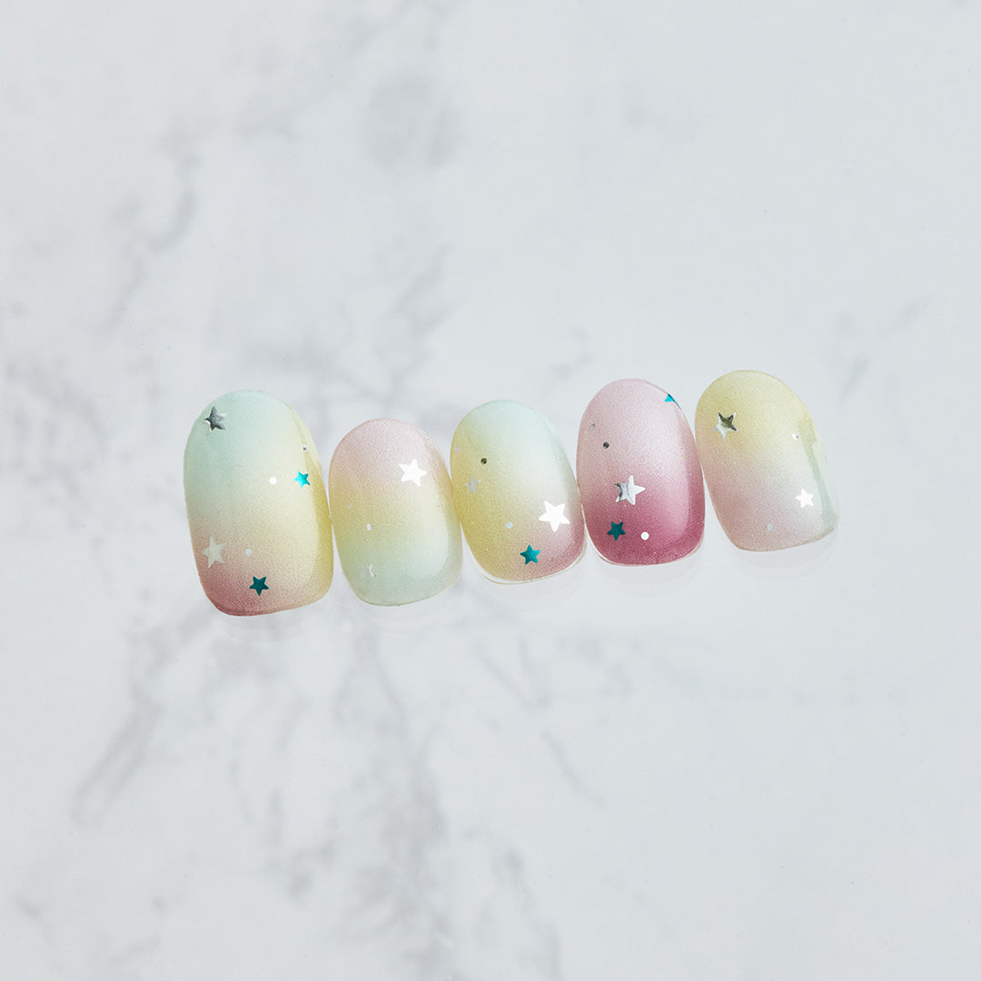 パステルトーンのグラデーションに、マグネットで神秘的なきらめきをプラス。動きや角度で色と輝きが変化し、指先の表情を豊かに見せます。シルバーとグリーンの箔の星モチーフが可愛らしいアクセントとなり、キッチュで愛らしい雰囲気に。アイスクリームのように甘く華やかで、毎日のファッションに心地よい彩りを添えます。