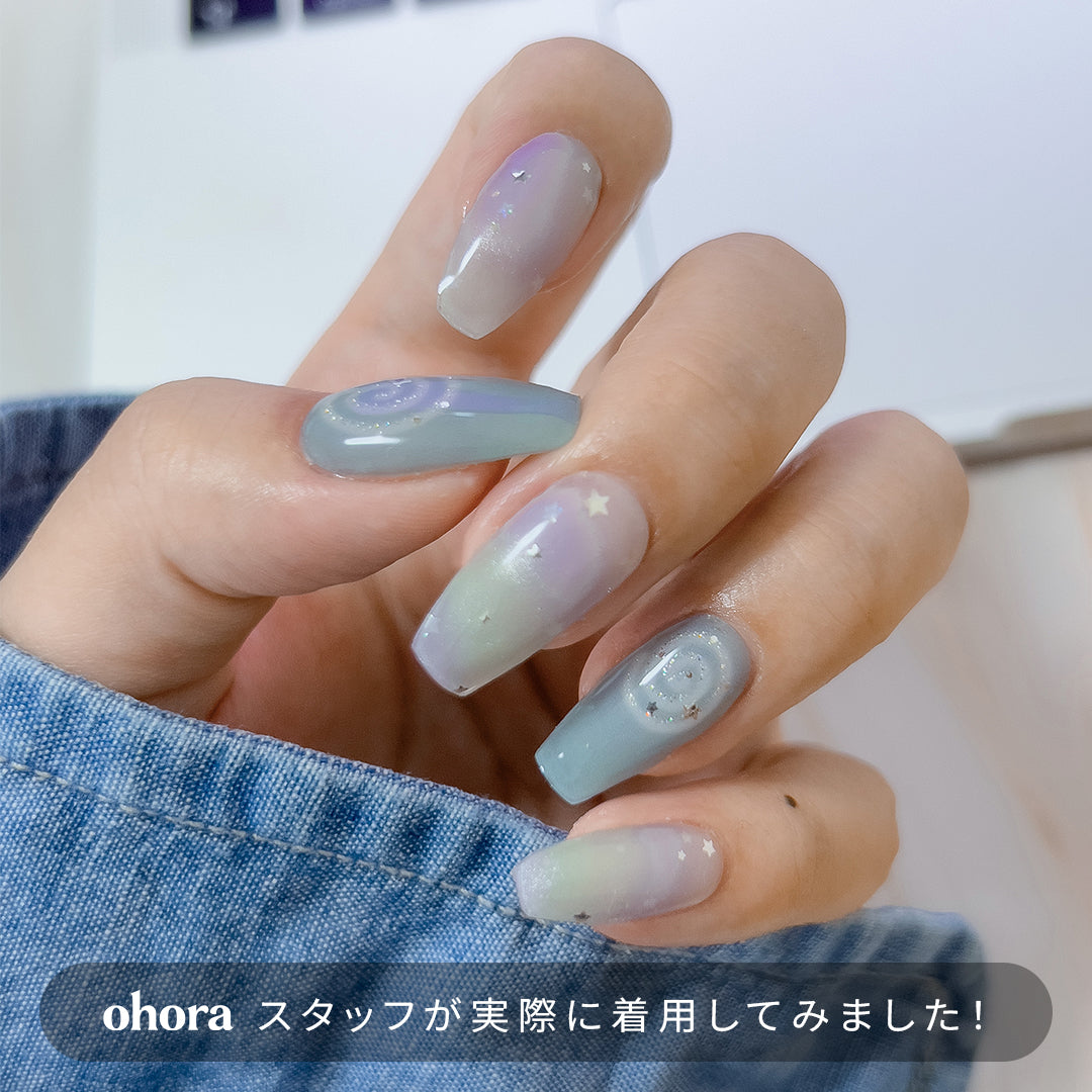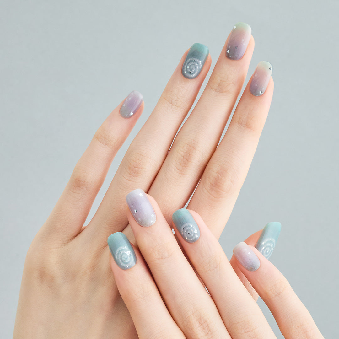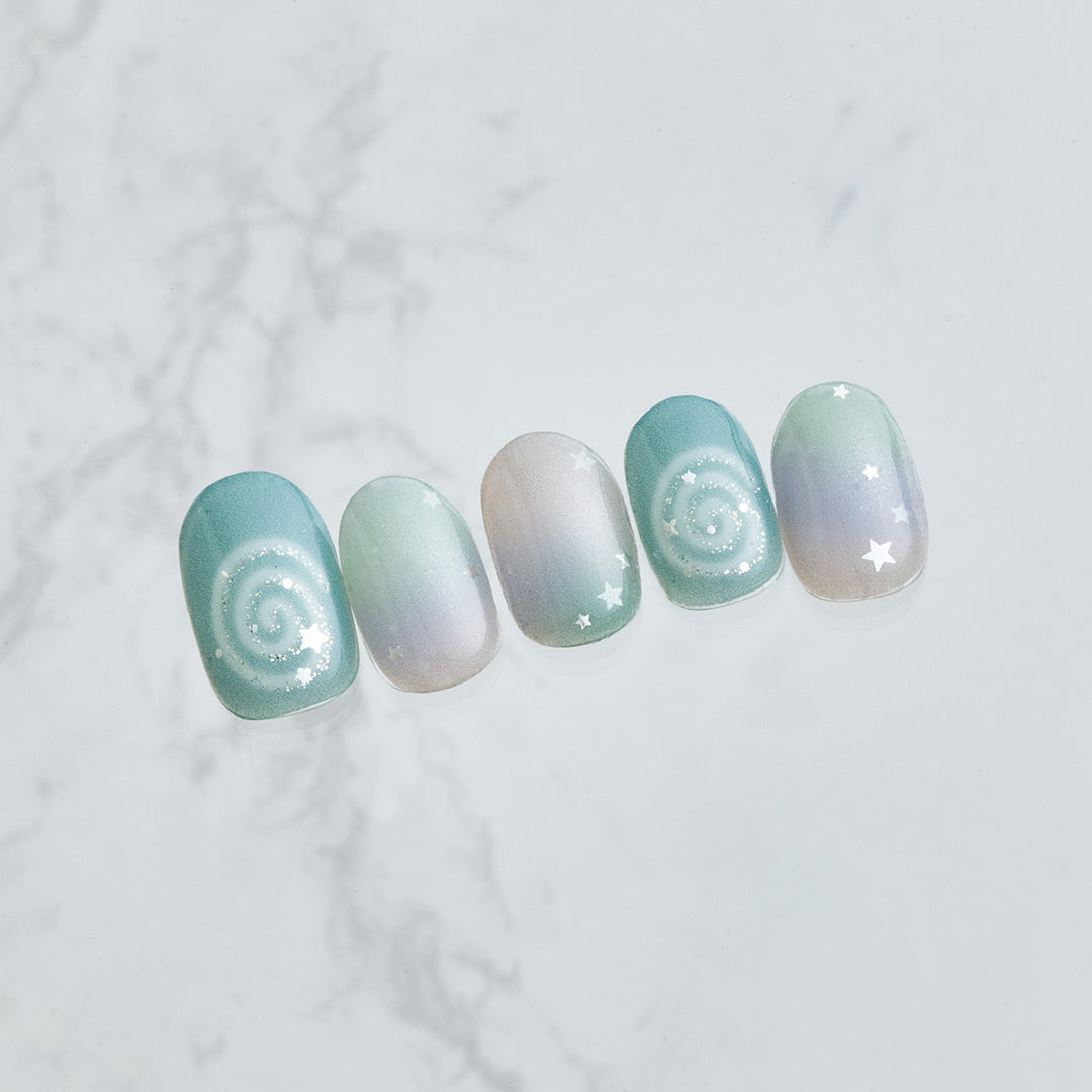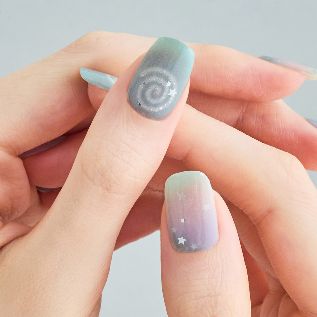 透明感のある淡いパステルカラーのマーブルに、ほのかに輝くマグネットグリッターを降らせ、天の川のようなファンタジックな雰囲気を演出。流れるように渦巻くスワールパターンのなかで、星のモチーフがきらめきます。多彩な輝きと混じり合う色は、宇宙のようにもバスボムのようにも見え、温かみのあるロマンチックなムードが指先に広がります。