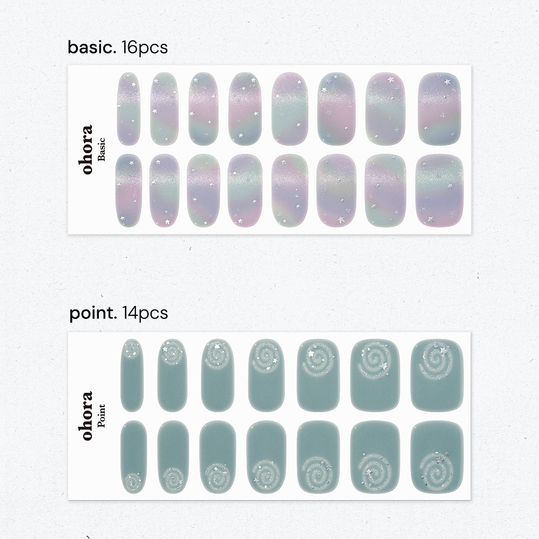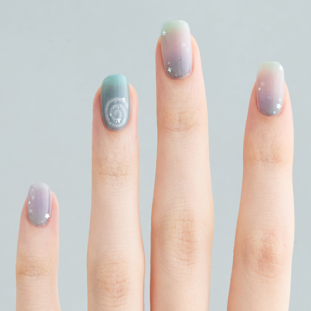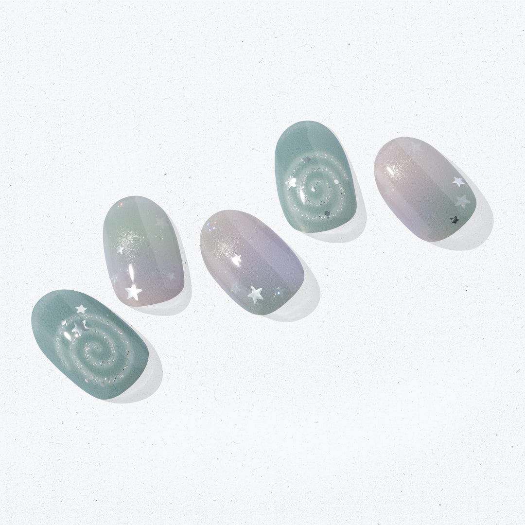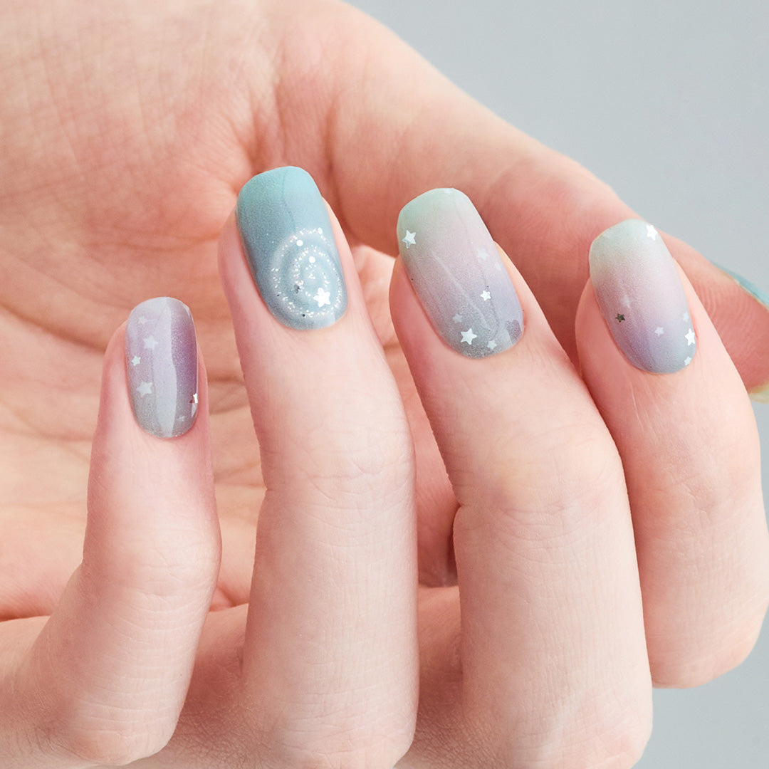 透明感のある淡いパステルカラーのマーブルに、ほのかに輝くマグネットグリッターを降らせ、天の川のようなファンタジックな雰囲気を演出。流れるように渦巻くスワールパターンのなかで、星のモチーフがきらめきます。多彩な輝きと混じり合う色は、宇宙のようにもバスボムのようにも見え、温かみのあるロマンチックなムードが指先に広がります。