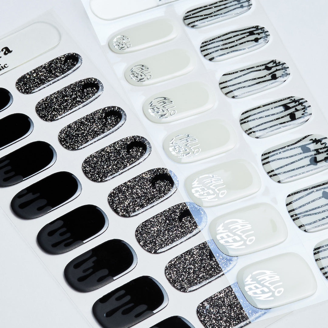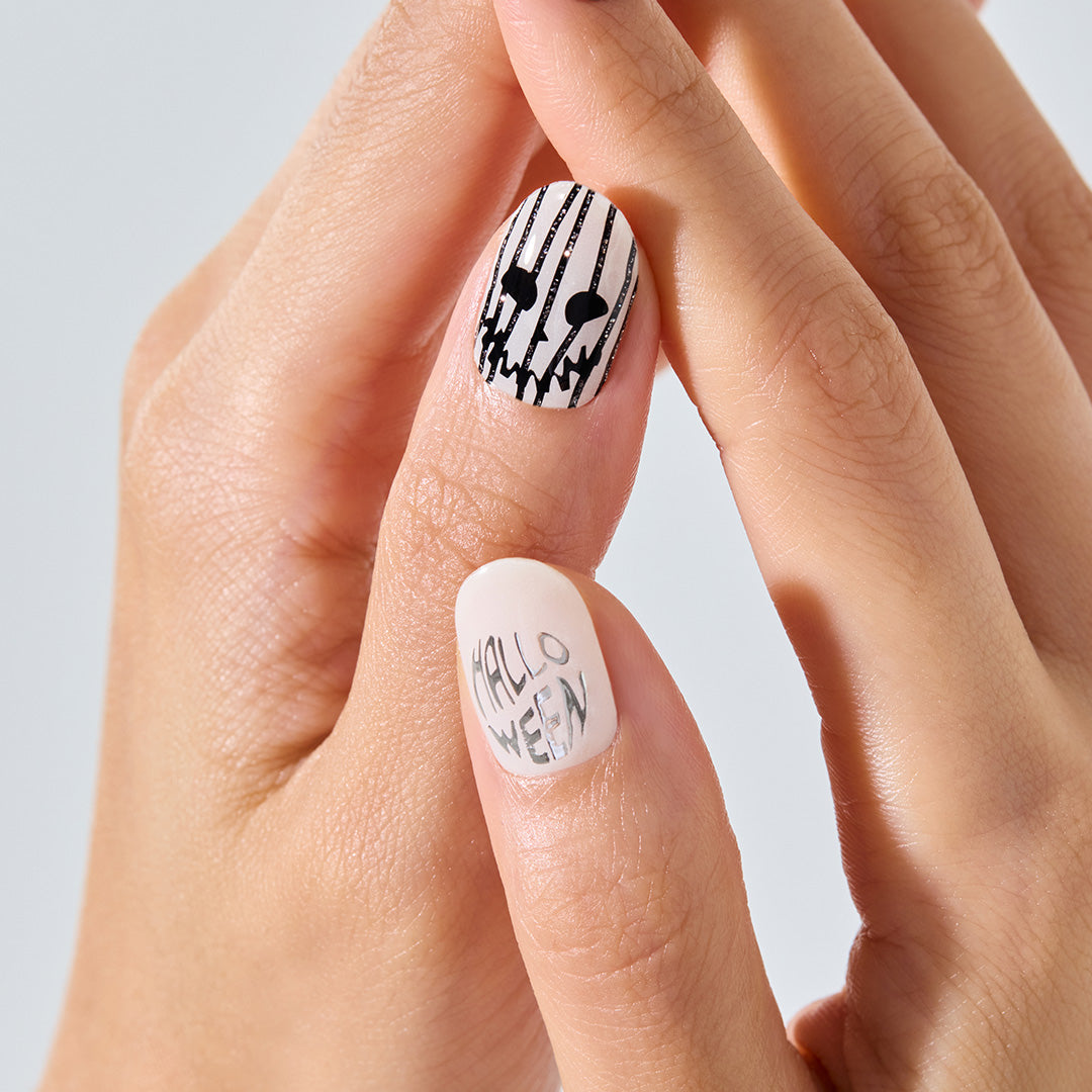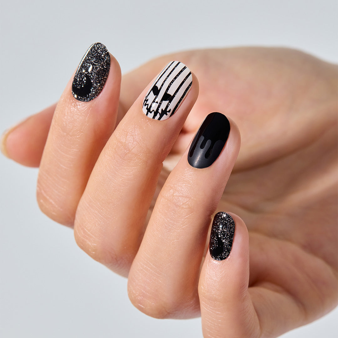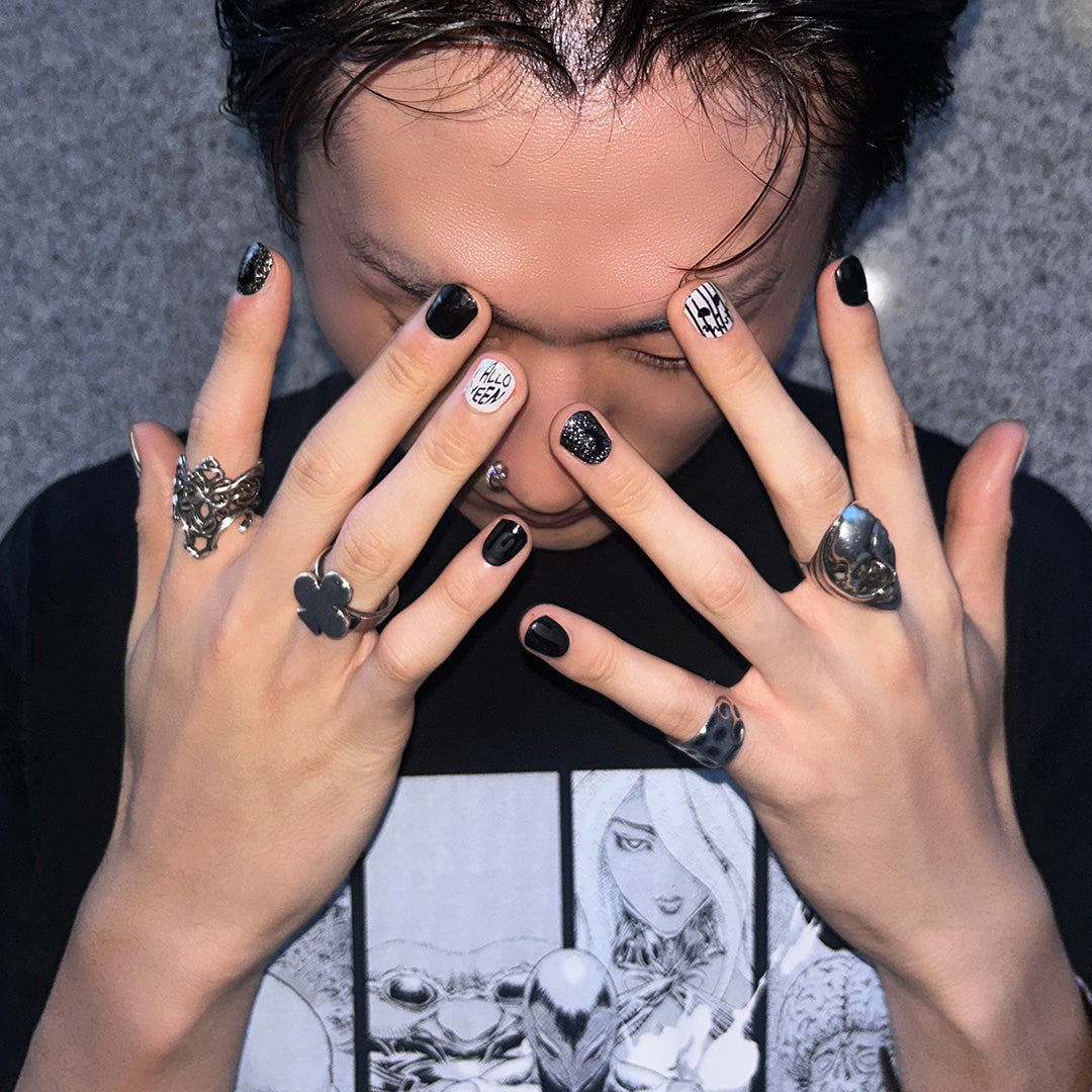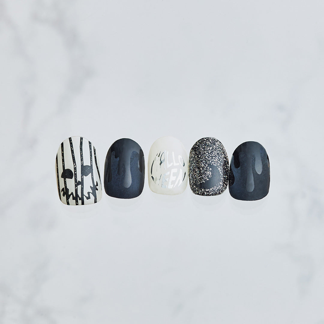 ブラックとホワイトの強いコントラストに、スライムみたいにとろけるようなストリート風アートをオン。ガイコツや月などのハロウィン気分をくすぐるモチーフが浮かび上り、シルバーの箔やダークグレーのグリッターが月光のような静かな輝きを放ちます。ジェンダーレスな魅力で、誰もが楽しめるデザインです。