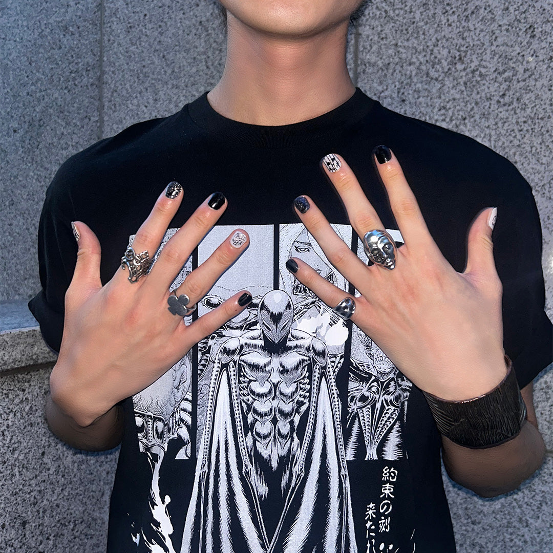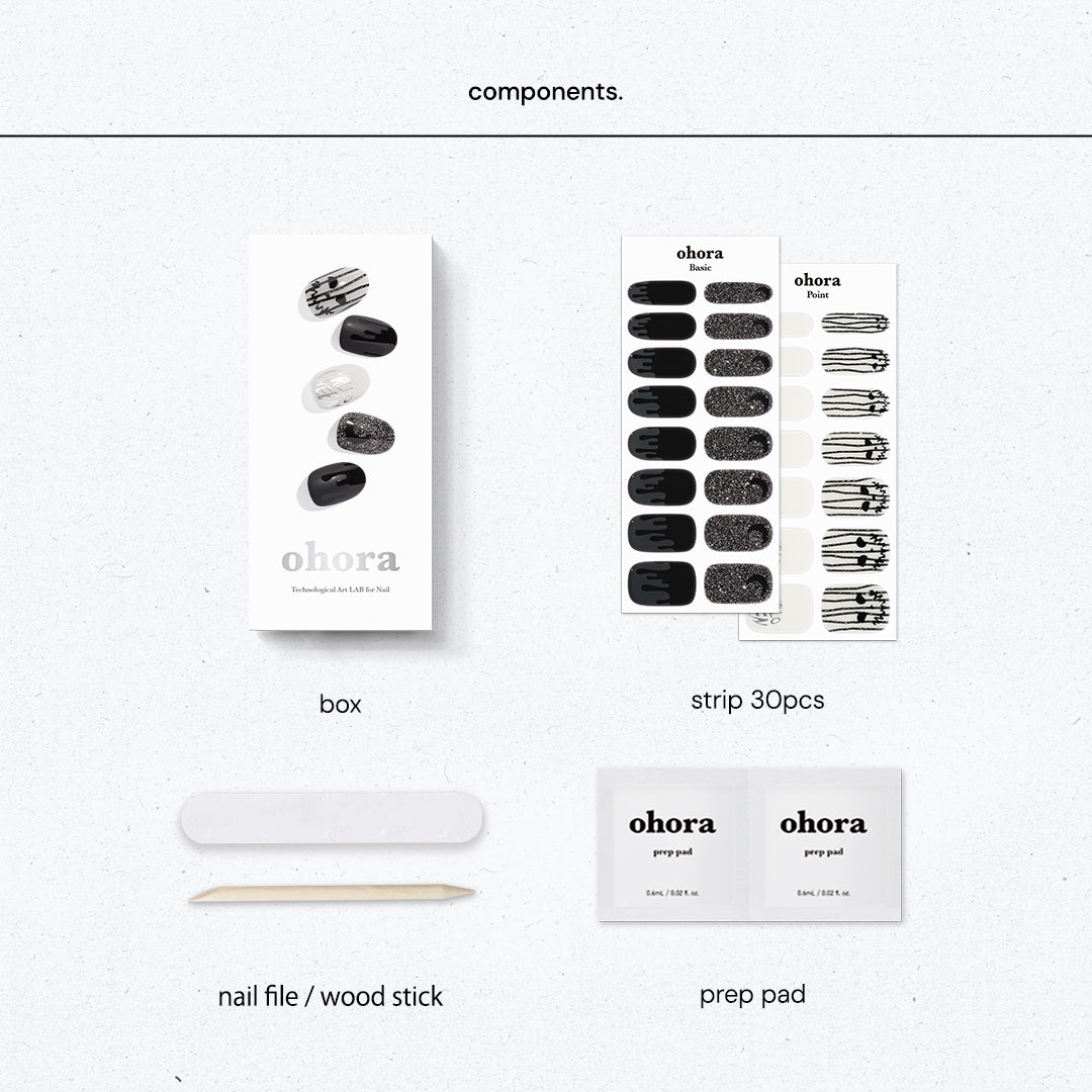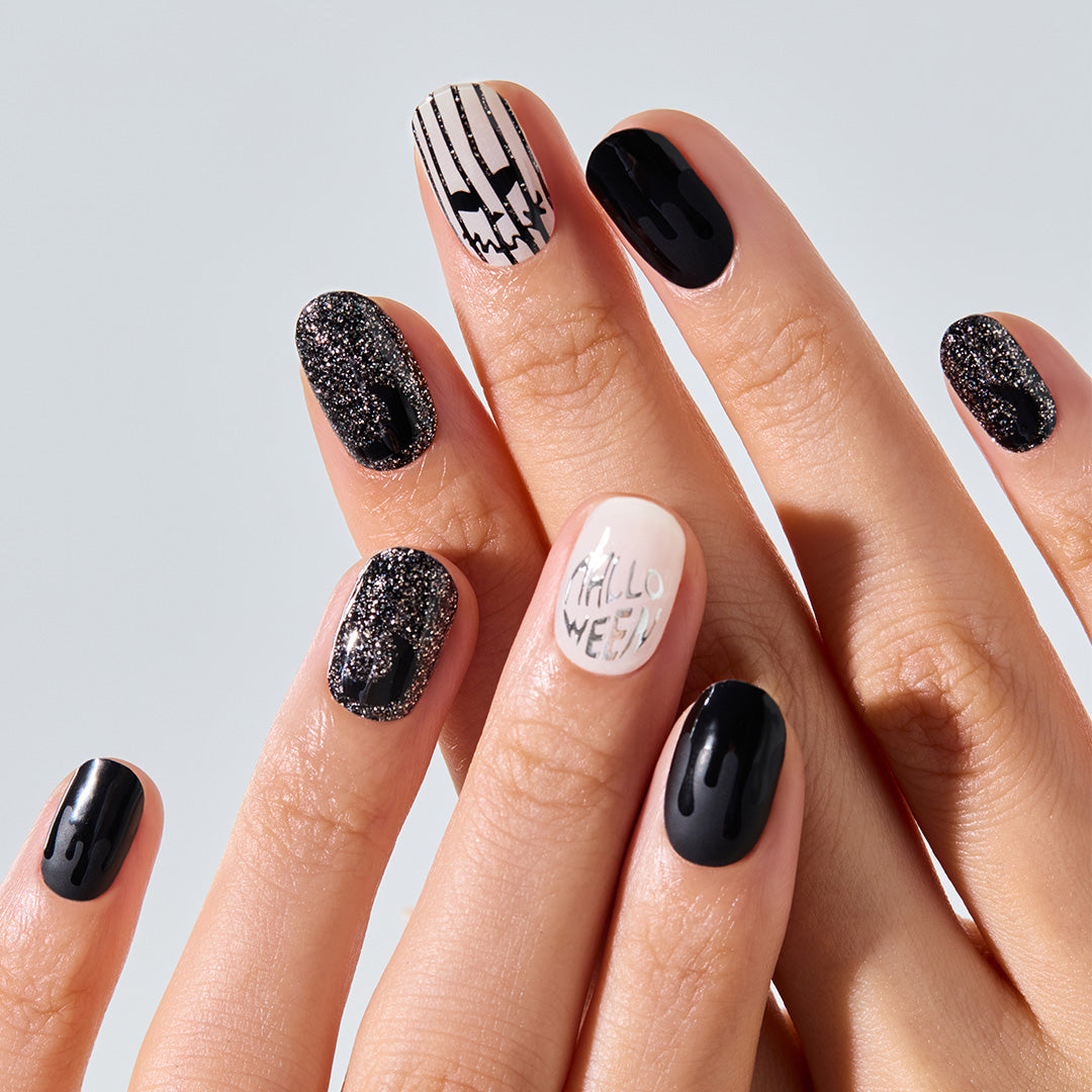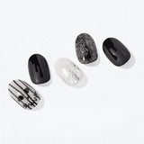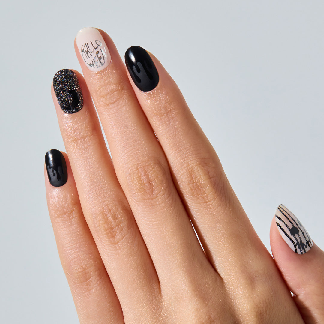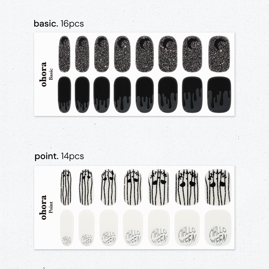 ブラックとホワイトの強いコントラストに、スライムみたいにとろけるようなストリート風アートをオン。ガイコツや月などのハロウィン気分をくすぐるモチーフが浮かび上り、シルバーの箔やダークグレーのグリッターが月光のような静かな輝きを放ちます。ジェンダーレスな魅力で、誰もが楽しめるデザインです。