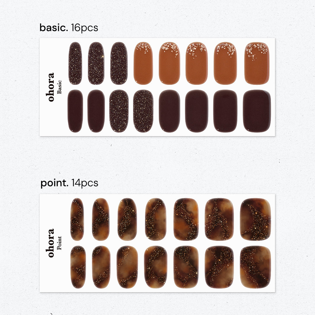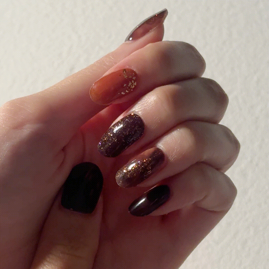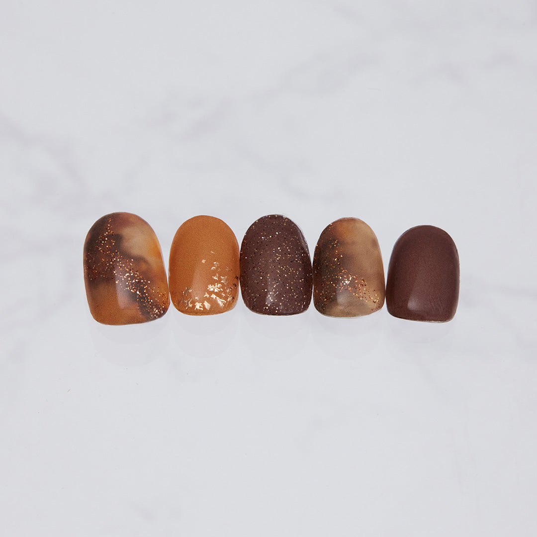 落ち着きのあるブラウンをベースに、ブロンズゴールドのグリッターと上品なゴールド箔を組み合わせたエレガントなデザイン。マーブルが描くやわらかな流れは、カフェラテのように深みと温もりを伝え、グリッターの輝きが手もとをいきいきと見せます。日常からパーティーまで、どんなシーンにもやさしく映えます。