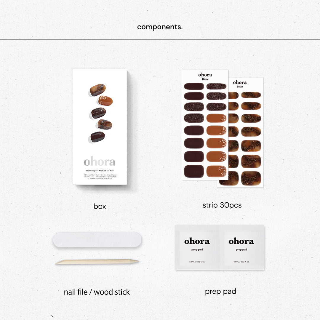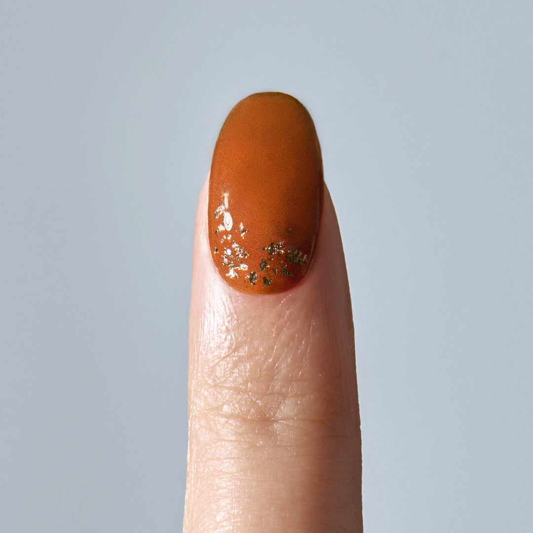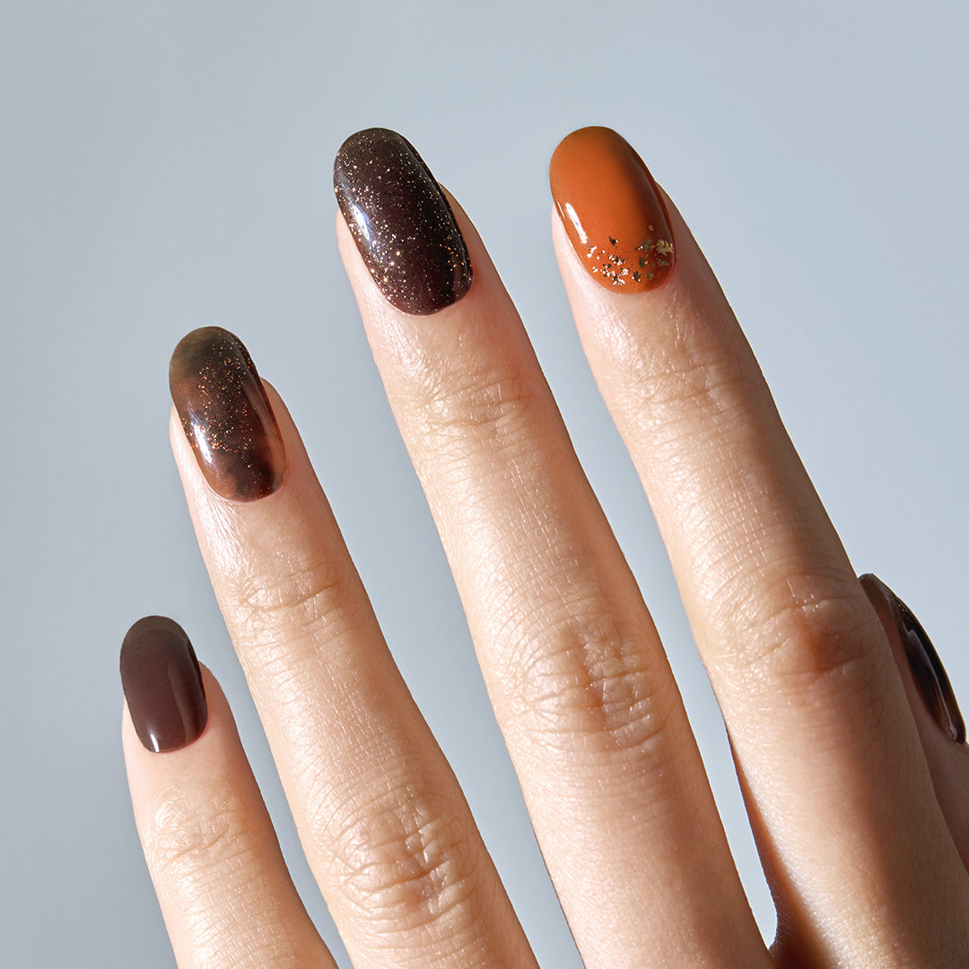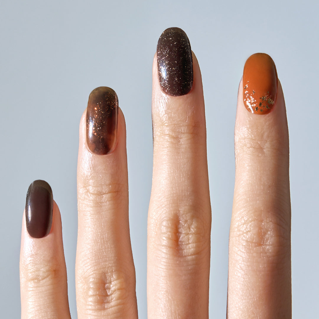 落ち着きのあるブラウンをベースに、ブロンズゴールドのグリッターと上品なゴールド箔を組み合わせたエレガントなデザイン。マーブルが描くやわらかな流れは、カフェラテのように深みと温もりを伝え、グリッターの輝きが手もとをいきいきと見せます。日常からパーティーまで、どんなシーンにもやさしく映えます。
