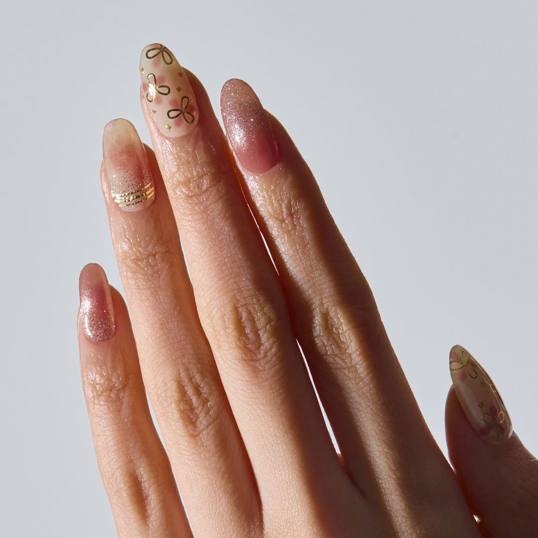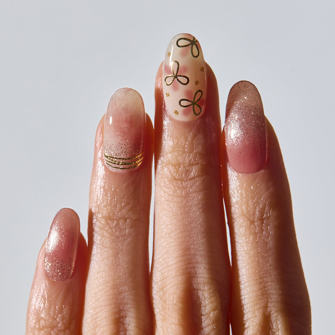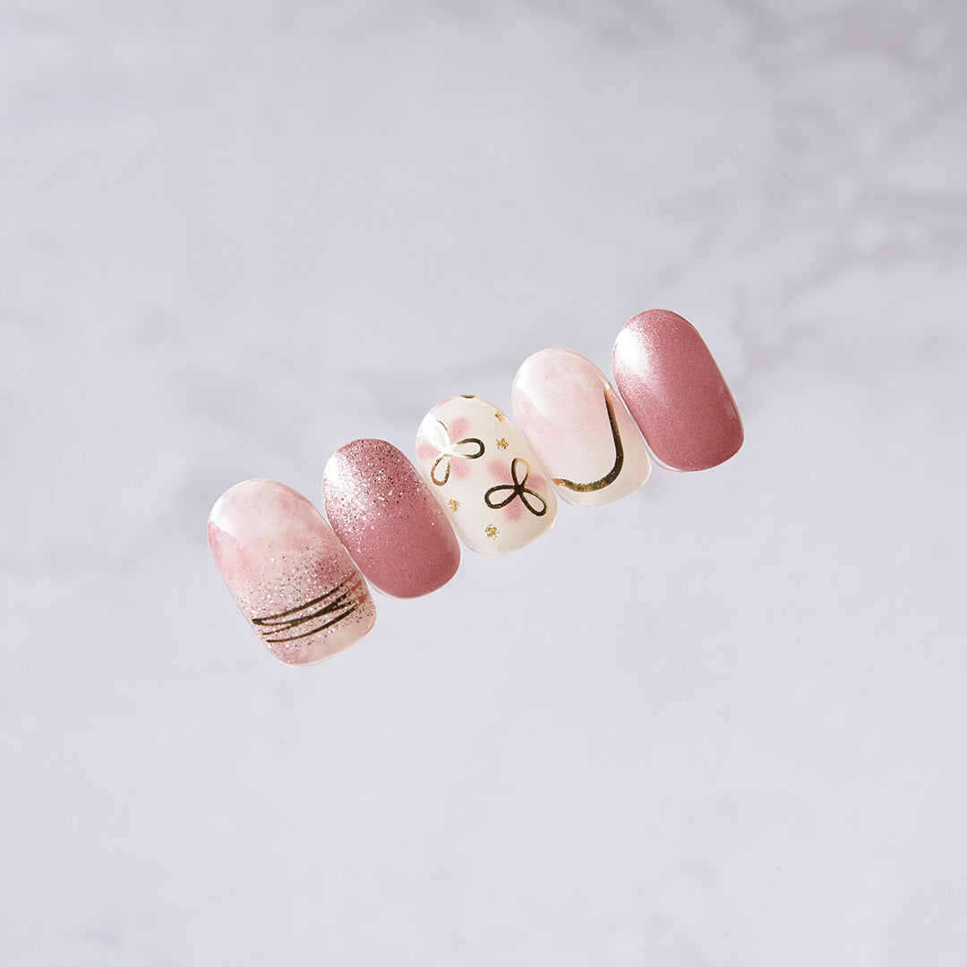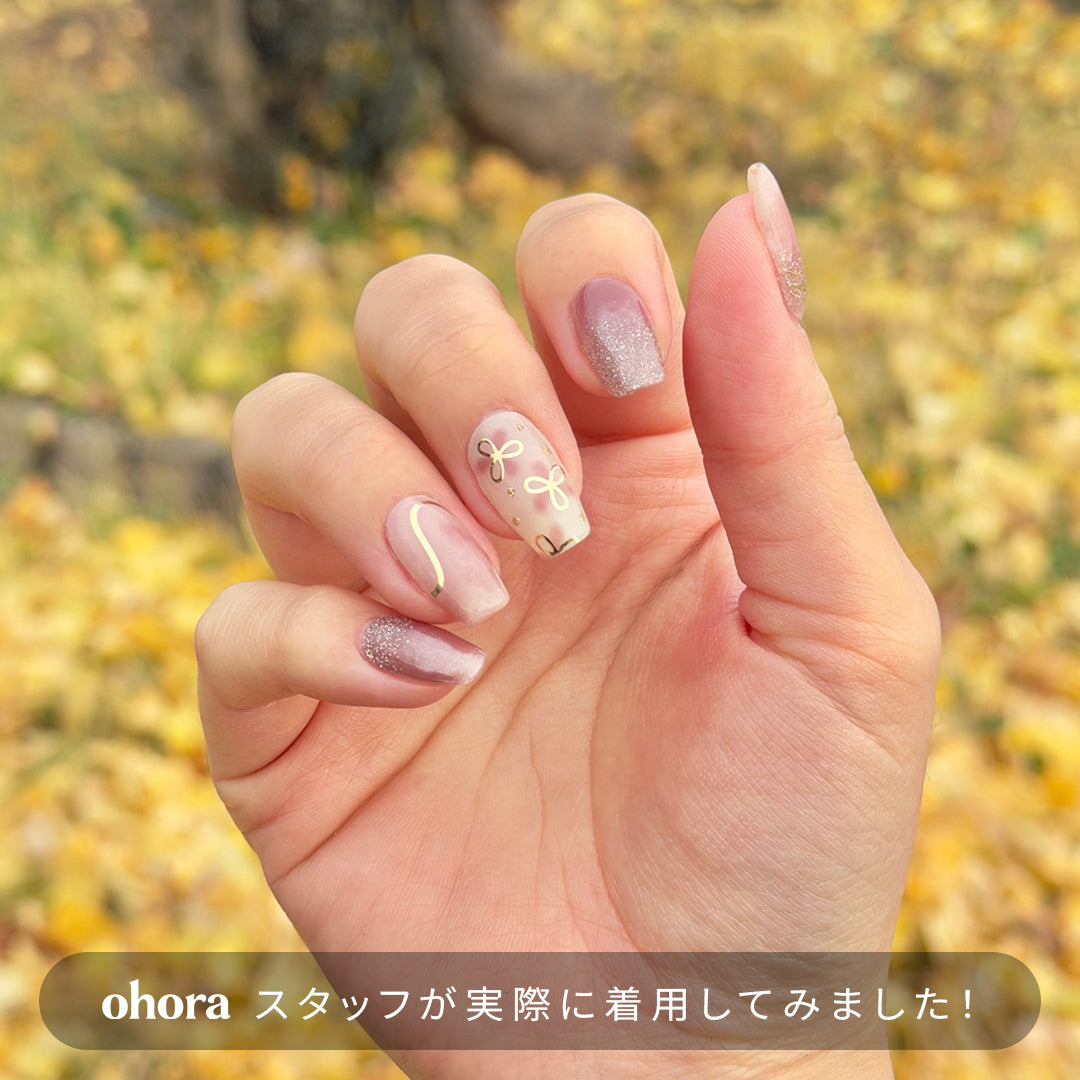 ローズブラウンのベースにフローラルアートがふんわりとにじむ、ナチュラルな仕上がりのデザイン。ゴールドグリッターとマグネットパウダーがやさしい光を放ち、指先に上品なツヤ感をまとわせます。ゴールドのラインとリボンモチーフが心地よいリズムを生み、デイリーからドレッシーなスタイルまでおまかせ。