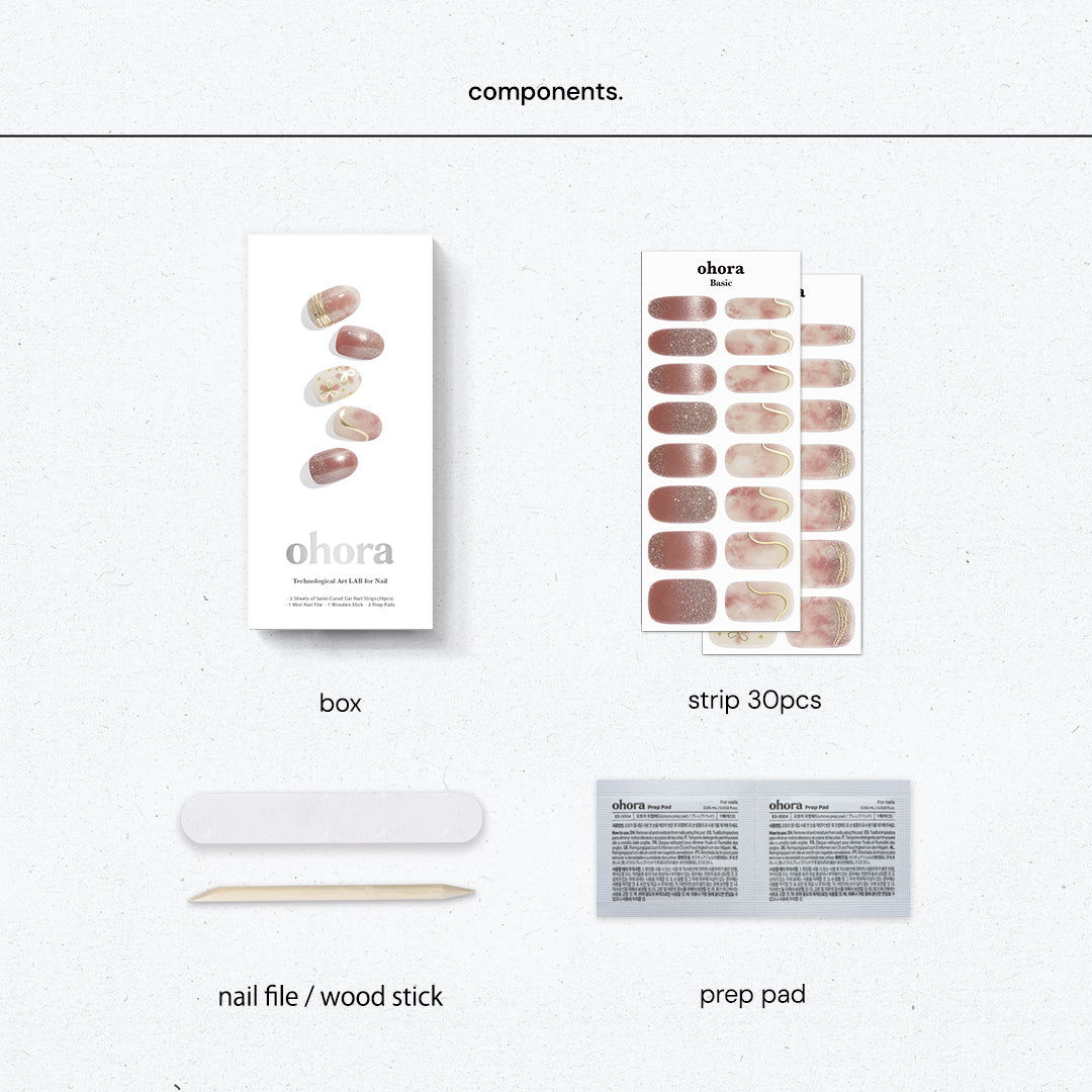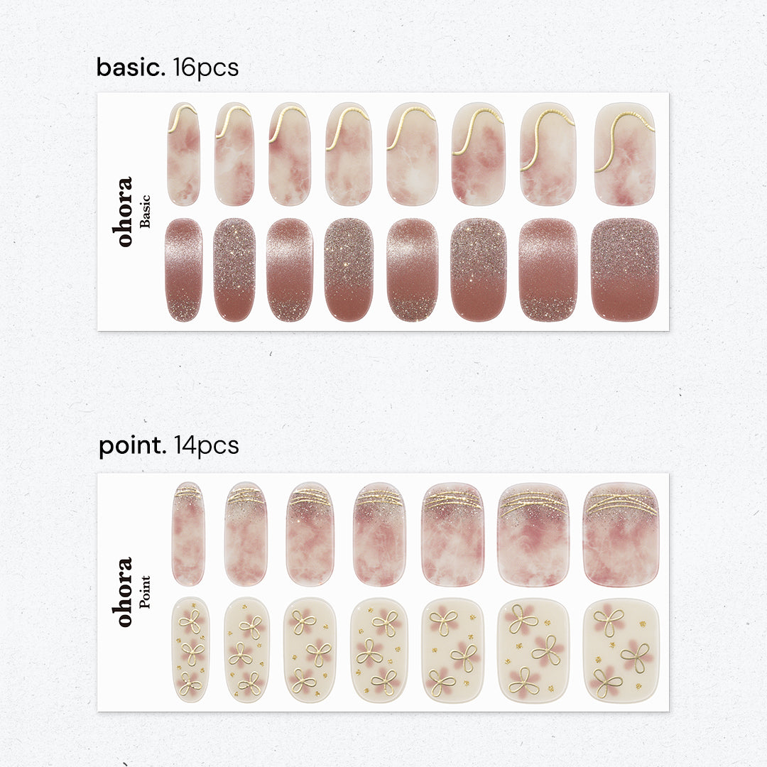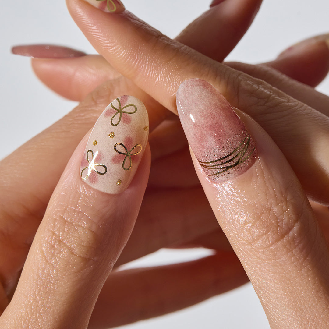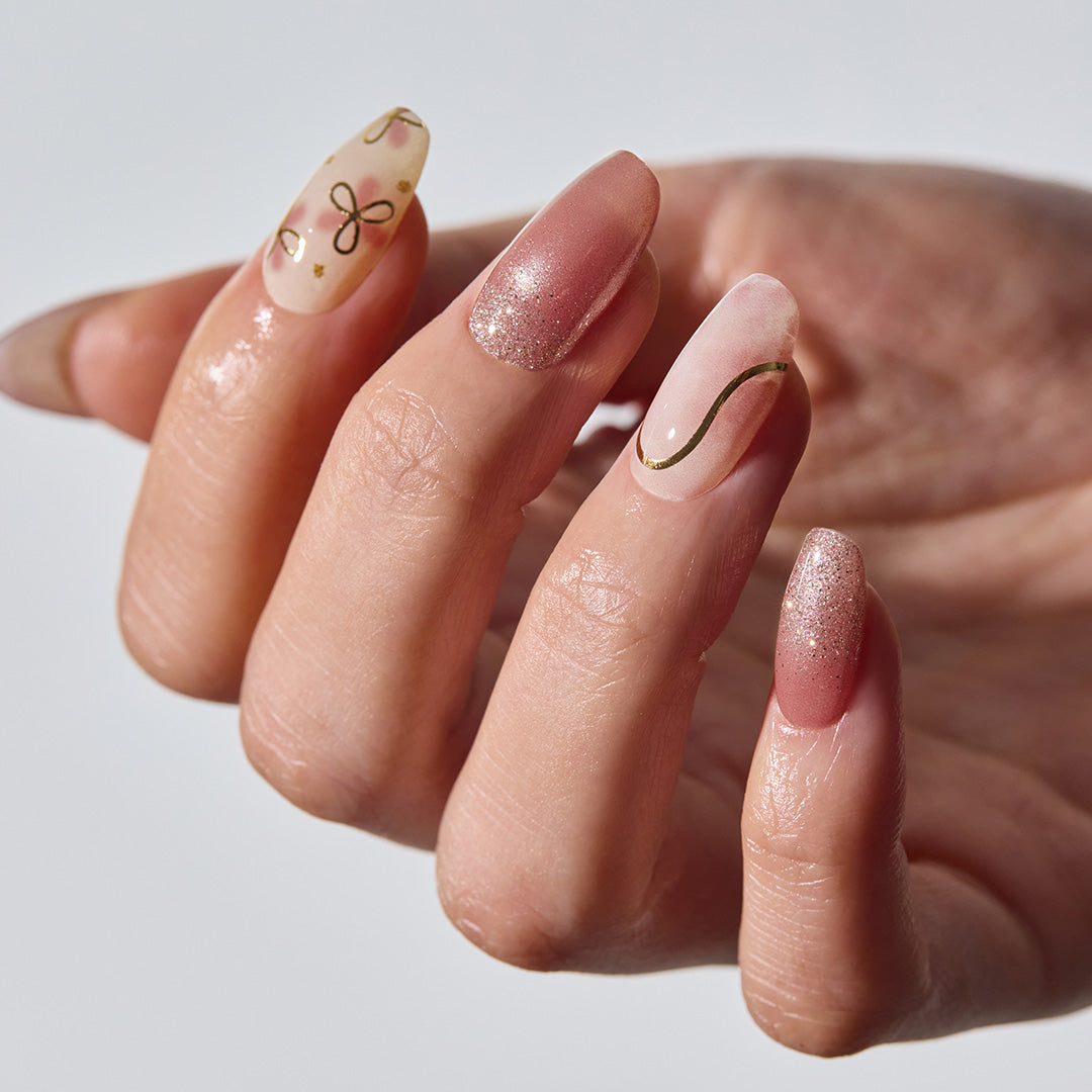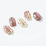 ローズブラウンのベースにフローラルアートがふんわりとにじむ、ナチュラルな仕上がりのデザイン。ゴールドグリッターとマグネットパウダーがやさしい光を放ち、指先に上品なツヤ感をまとわせます。ゴールドのラインとリボンモチーフが心地よいリズムを生み、デイリーからドレッシーなスタイルまでおまかせ。