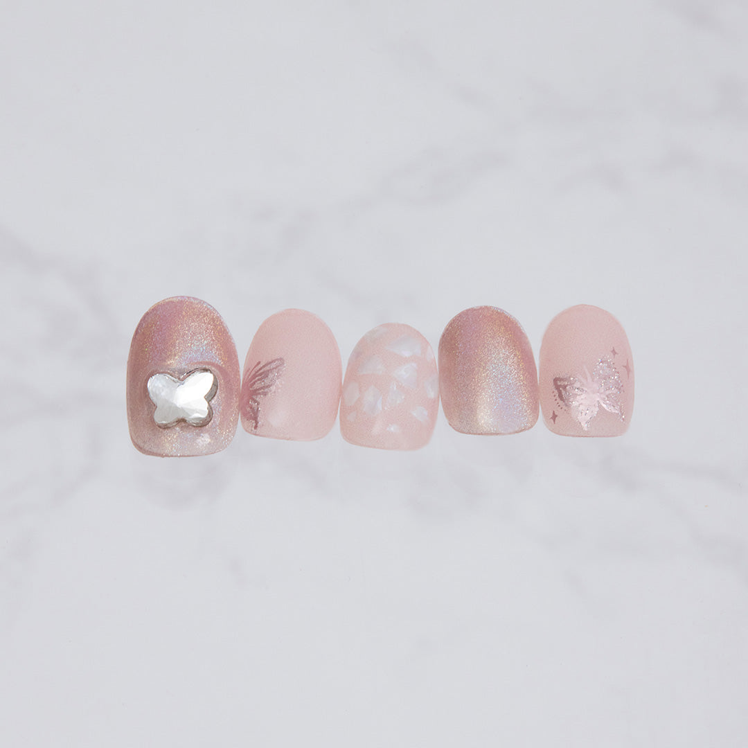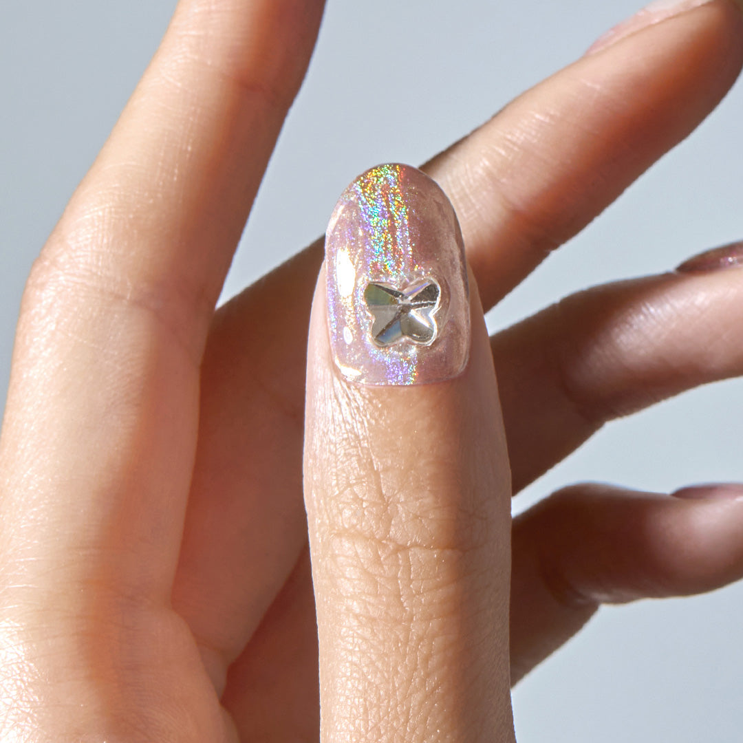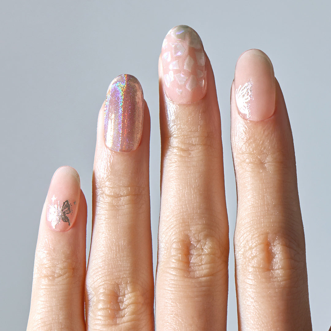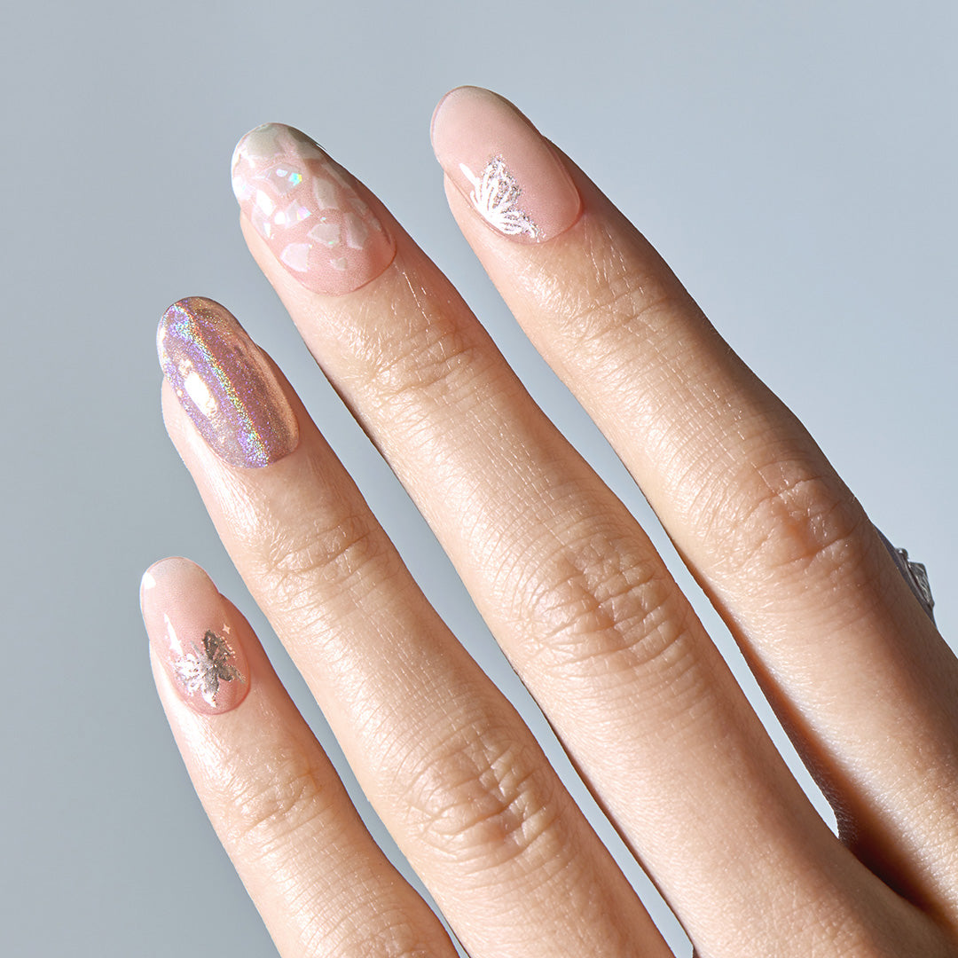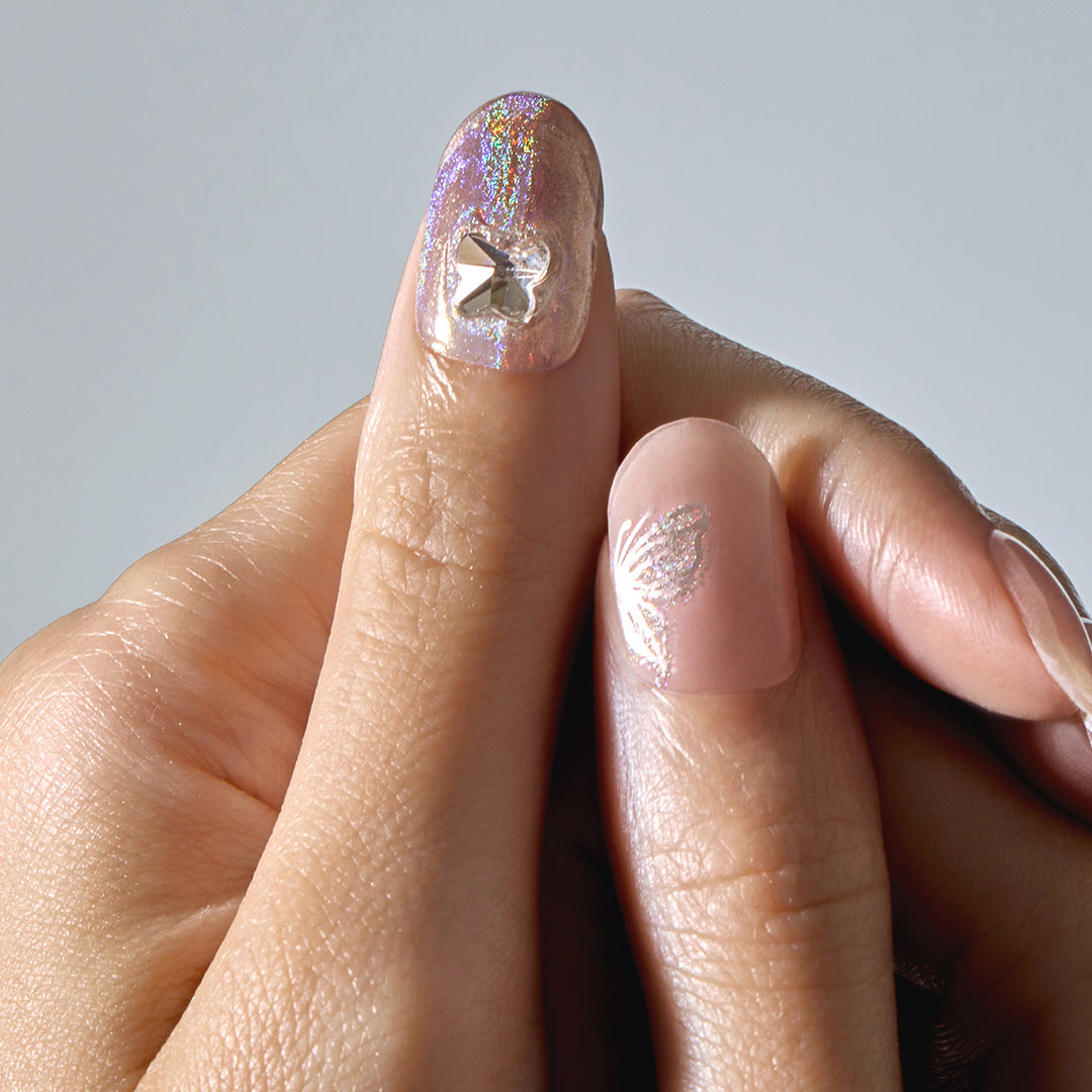 ほんのり血色感を帯びたピンクベースに重ねた、ホログラムミラーパウダーの繊細なグラデーションが、優雅で華やかな印象を与えます。透明感を放つシェルやピンクの箔、立体的なクリスタルのバタフライパーツに、手描きのアートが調和。蝶が舞い上がるようなイキイキとした躍動感と上品なきらめきが指先に広がります。