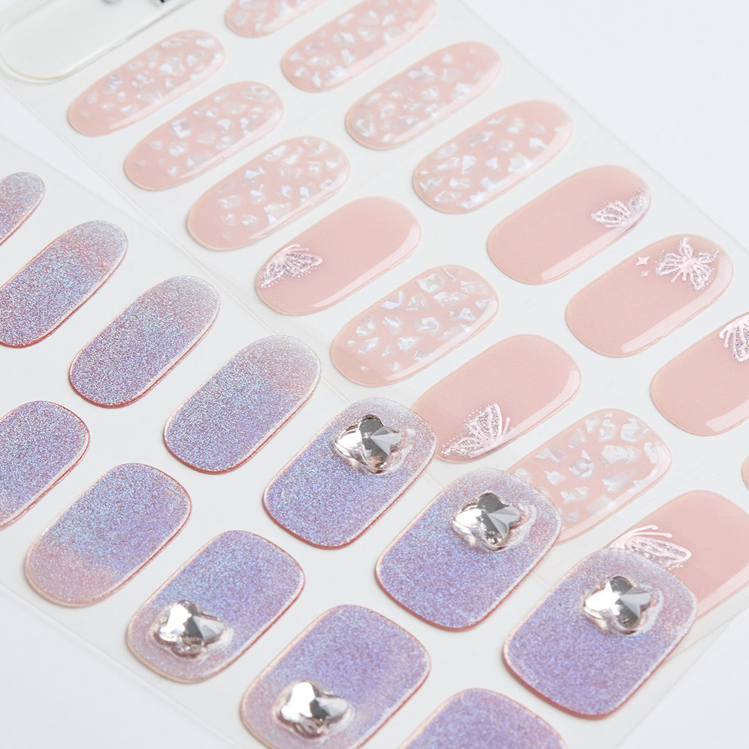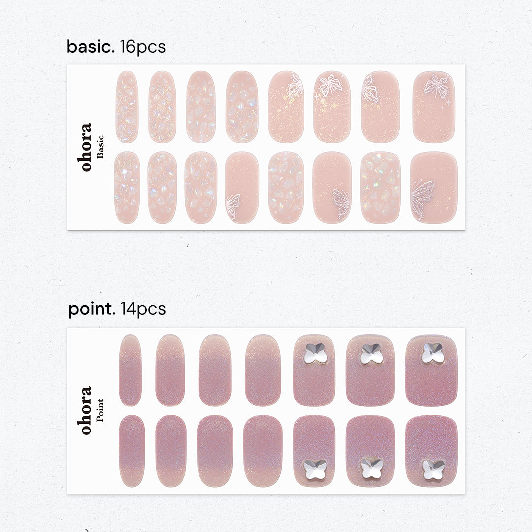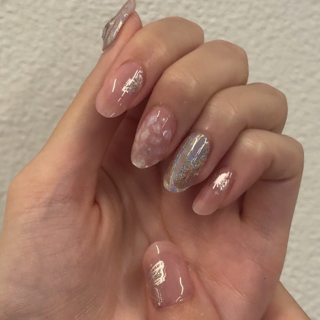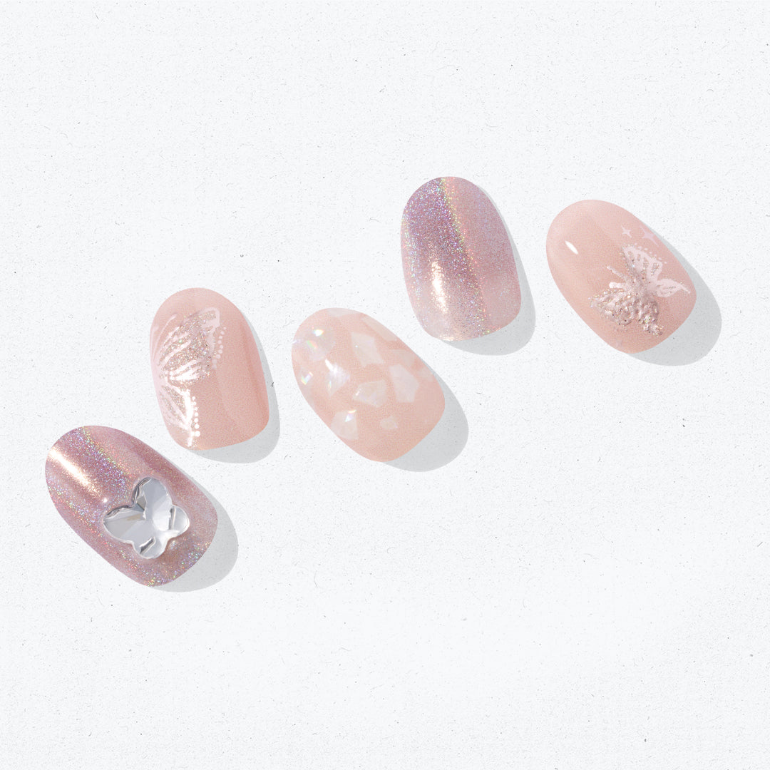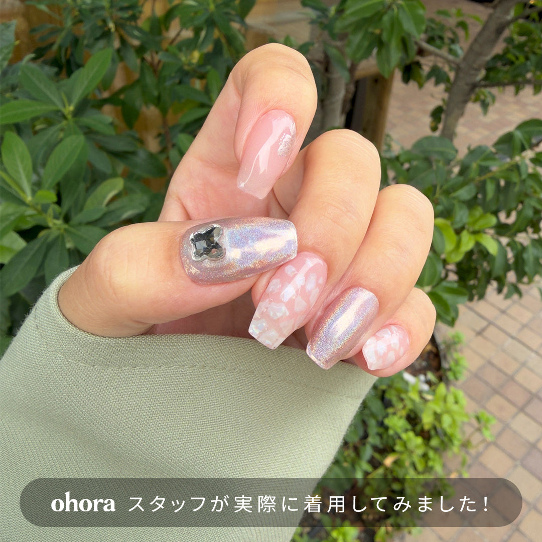 ほんのり血色感を帯びたピンクベースに重ねた、ホログラムミラーパウダーの繊細なグラデーションが、優雅で華やかな印象を与えます。透明感を放つシェルやピンクの箔、立体的なクリスタルのバタフライパーツに、手描きのアートが調和。蝶が舞い上がるようなイキイキとした躍動感と上品なきらめきが指先に広がります。