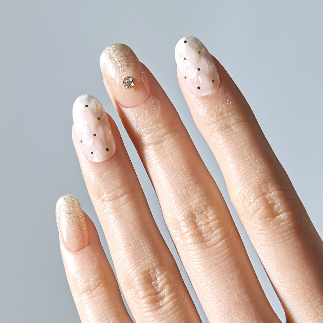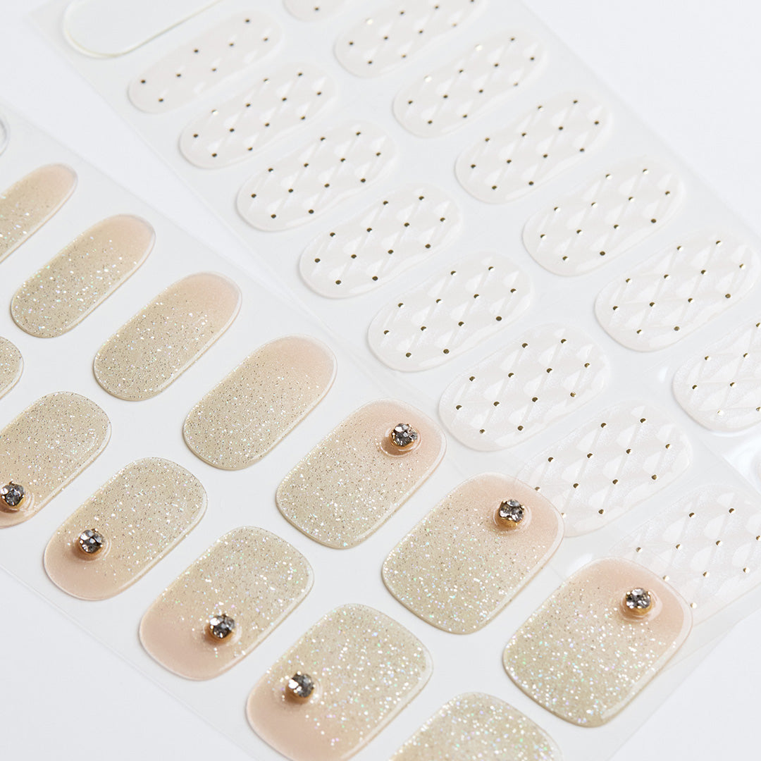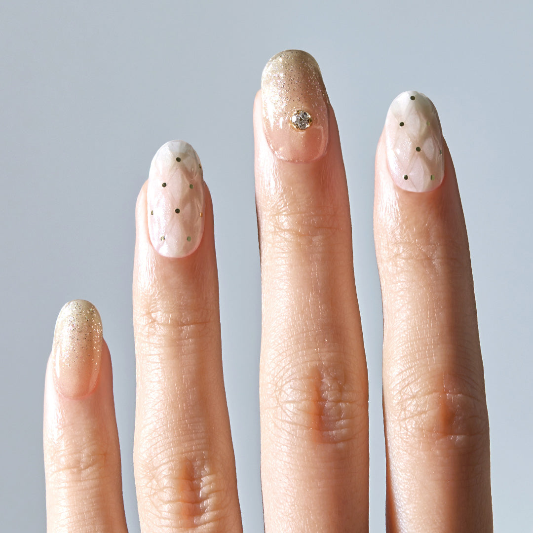 華やかで洗練されたパーティーシーンを思わせるデザイン。シャンパンの泡が弾けるように、グリッターが多彩なきらめきを放ち、指先を明るく照らします。キルティングのエンボスパターンがさらに高級感をプラス。ジュエリーのようにきらめくクリスタルパーツがアクセントとなり、格別のリュクス感で大切な時間をいっそう輝かせます。