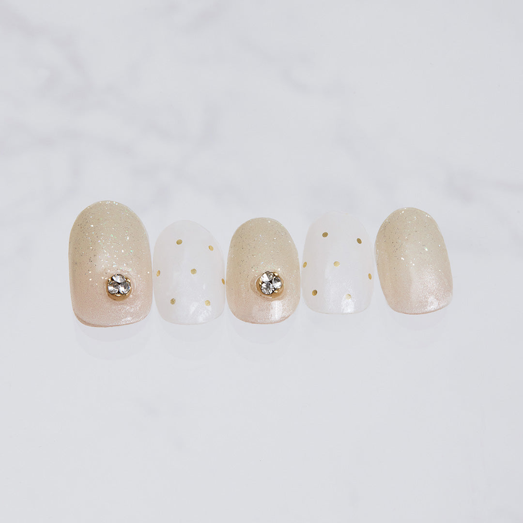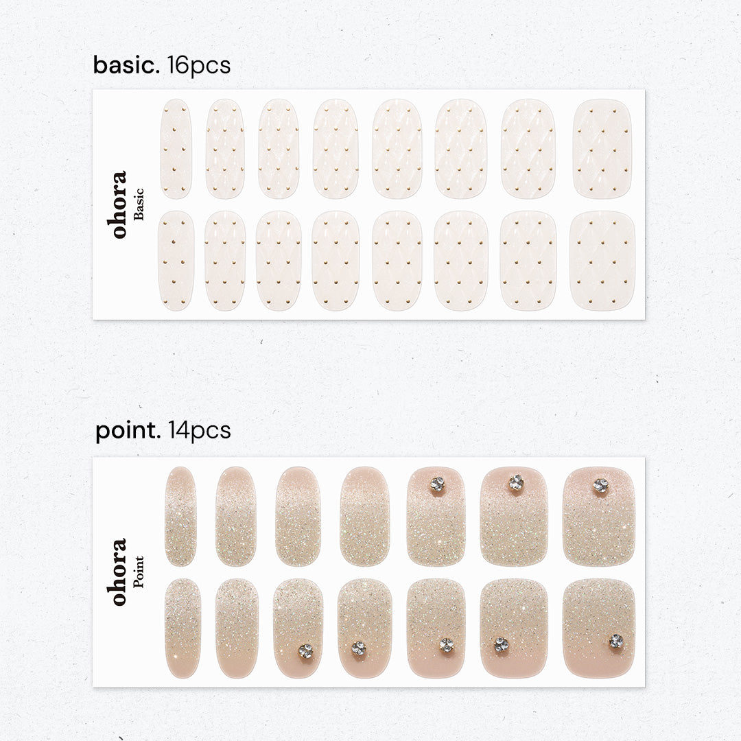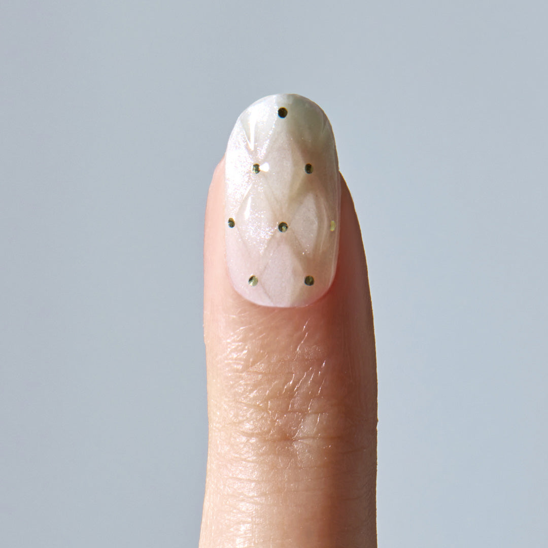 華やかで洗練されたパーティーシーンを思わせるデザイン。シャンパンの泡が弾けるように、グリッターが多彩なきらめきを放ち、指先を明るく照らします。キルティングのエンボスパターンがさらに高級感をプラス。ジュエリーのようにきらめくクリスタルパーツがアクセントとなり、格別のリュクス感で大切な時間をいっそう輝かせます。