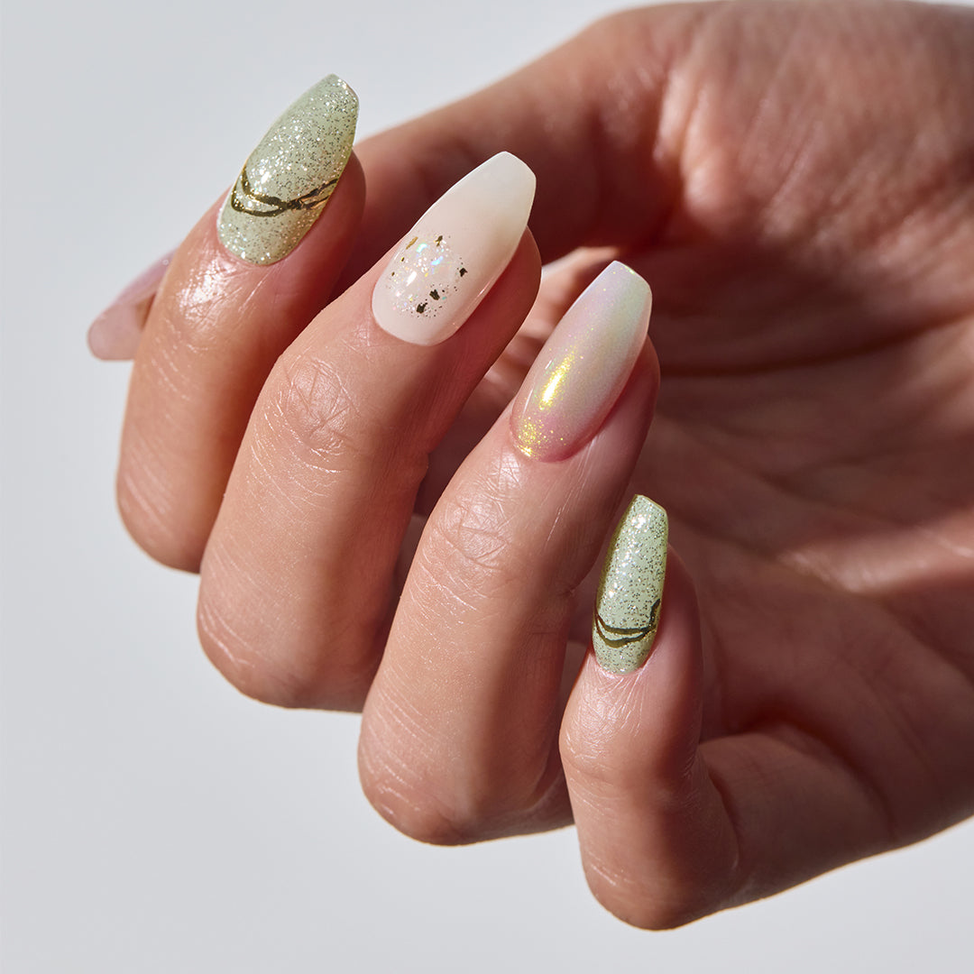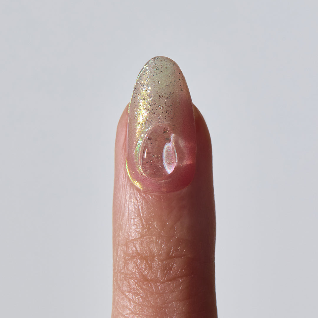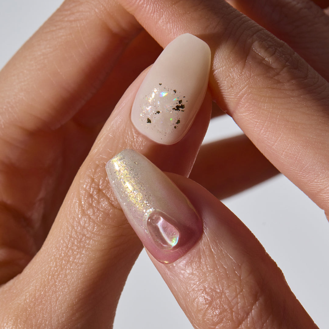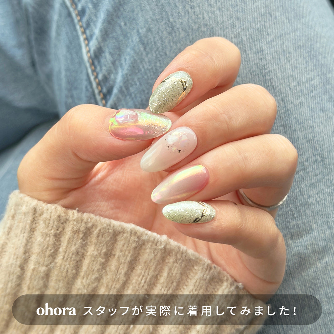 和菓子のような甘さとたおやかさを感じさせる上品なデザイン。シロップのように透明感のあるピンクグラデーションに、オーロラのミラーパウダーとプラチナグリッターが重なり、さらにゴールドラインとシェルパーツが色をつなぐように調和します。静けさの中にやさしい温もりがにじみ、ほのかな輝きが余韻を残します。