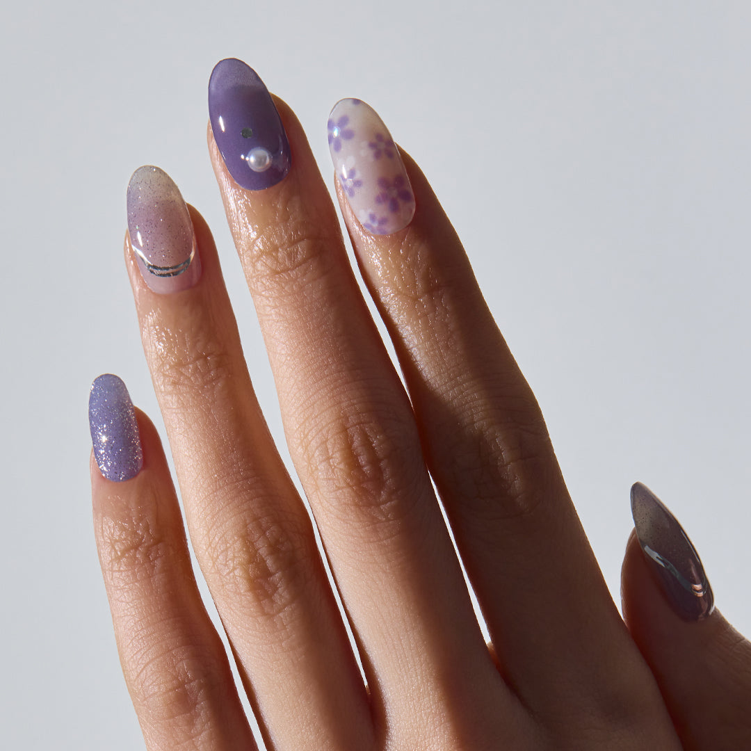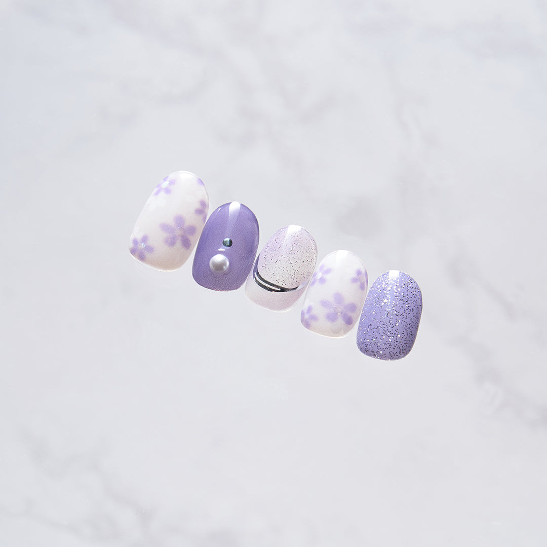 やさしく神秘的な印象をつくり出す、ミュートトーンのパープルとやわらかなホワイトの組み合わせ。グリッターとシルバーの箔が光の角度で繊細にきらめき、小さなパールが指先を包み込むような光沢感を添えます。落ち着いた上品さのなかに華やかさを感じさせ、手もとの表情を優雅に引き立てます。