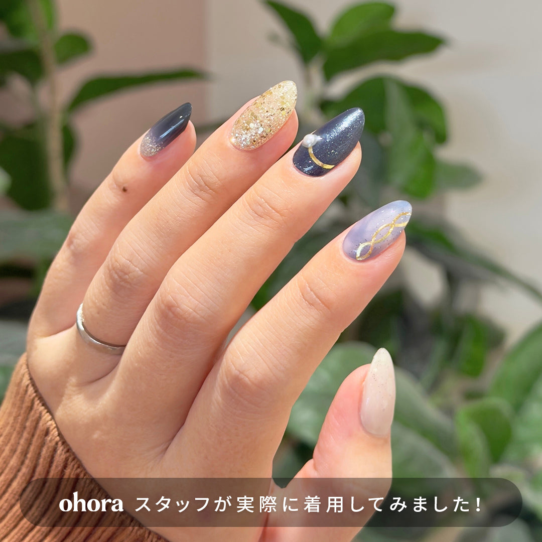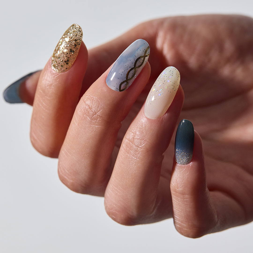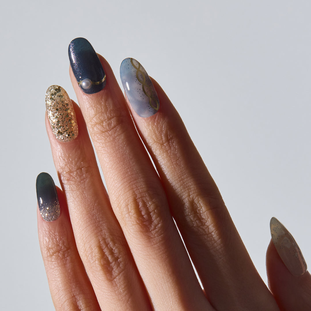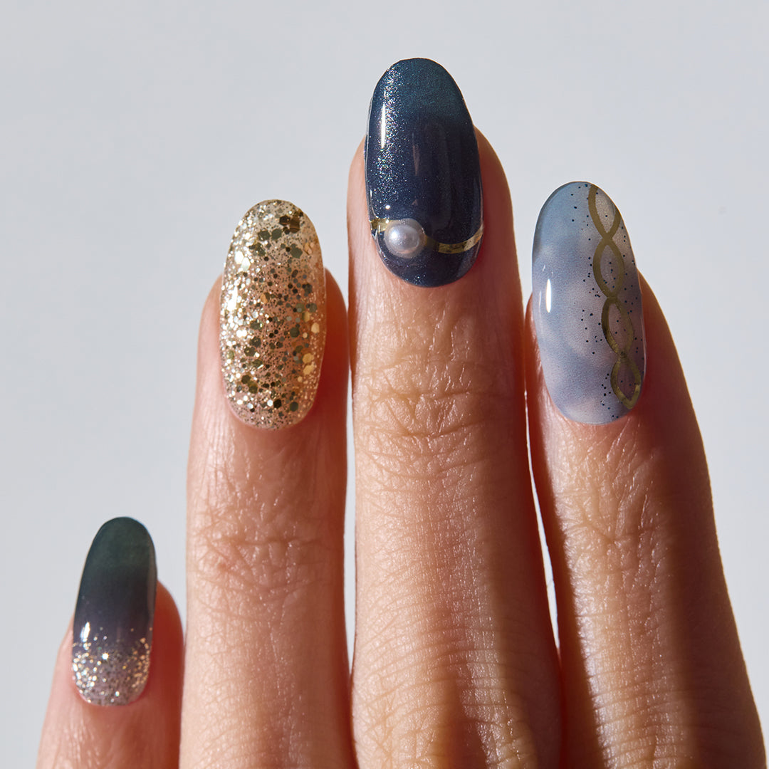 深みのあるネイビー×ゴールドの高級感あふれるデザイン。繊細なグリッターとパール、透明感のあるオーロラの箔が、夜空を照らす灯りのようにやさしく輝きます。さりげないゴールドラインが端正な指先に洗練を重ね、静かな美しさを引き立てます。