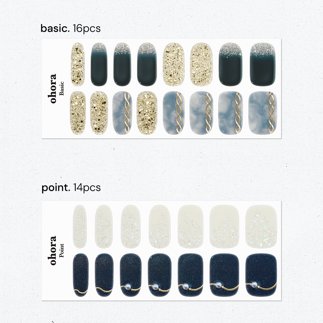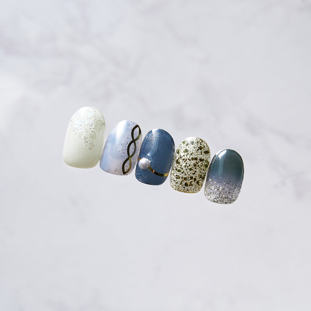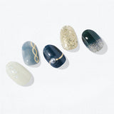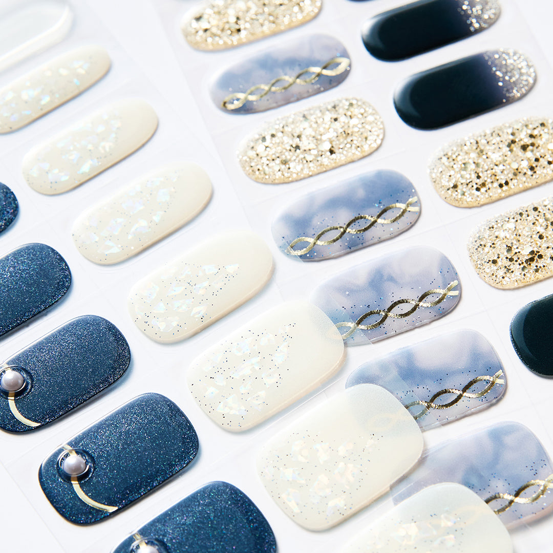 深みのあるネイビー×ゴールドの高級感あふれるデザイン。繊細なグリッターとパール、透明感のあるオーロラの箔が、夜空を照らす灯りのようにやさしく輝きます。さりげないゴールドラインが端正な指先に洗練を重ね、静かな美しさを引き立てます。