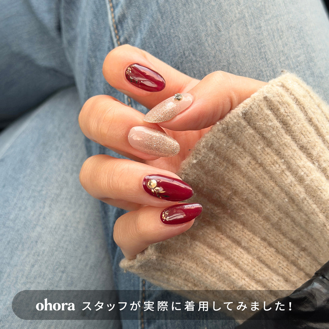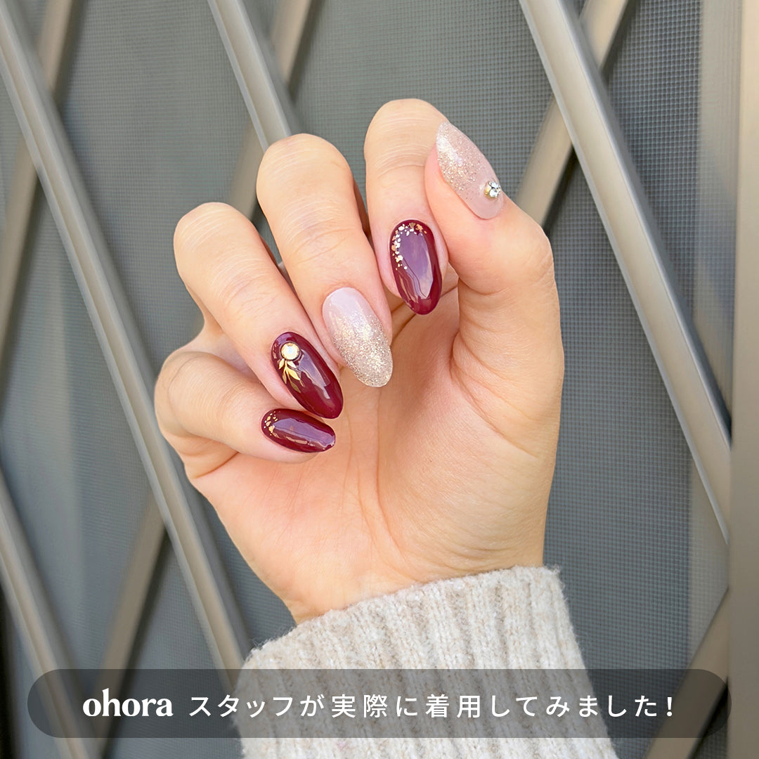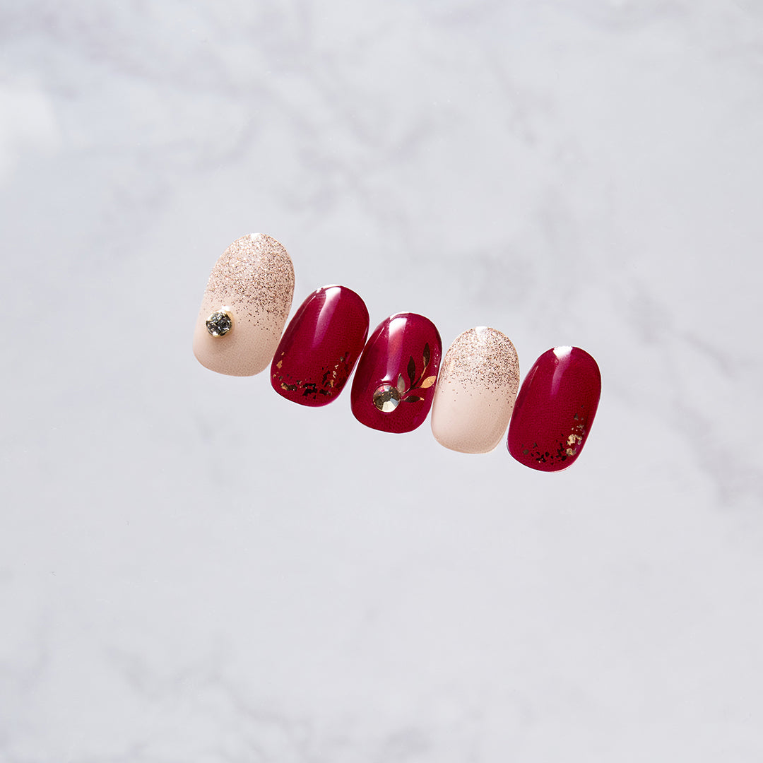 落ち着いたバーガンディレッドにゴールドの輝きを効かせた、エレガントなデザイン。グリッターとゴールド箔の輝きが溶け合い、リーフモチーフとクリスタルパーツが、さりげない華やかさを添えます。強さとやわらかさを併せ持つ配色が、手もとに品格ある存在感をもたらします。