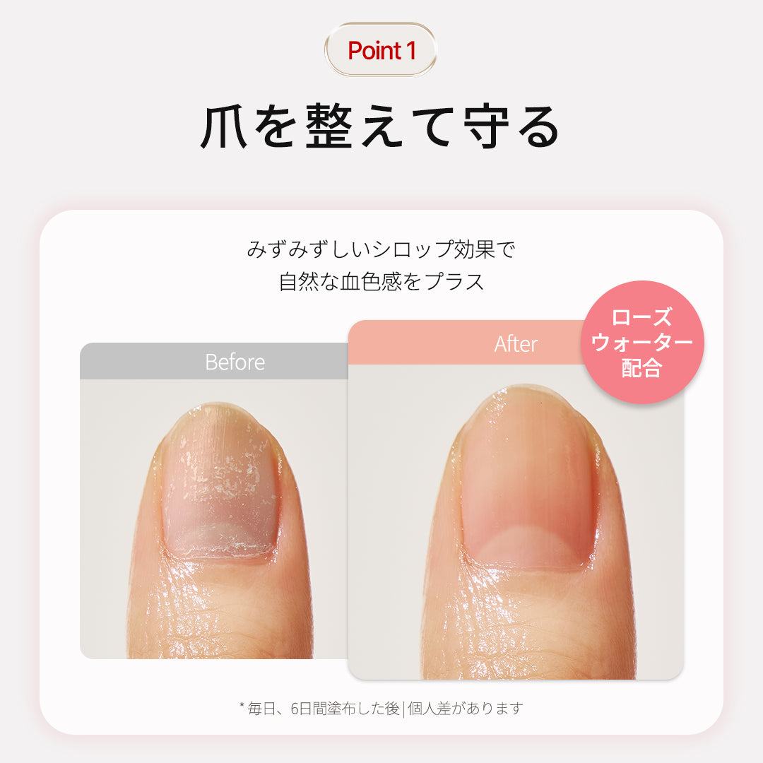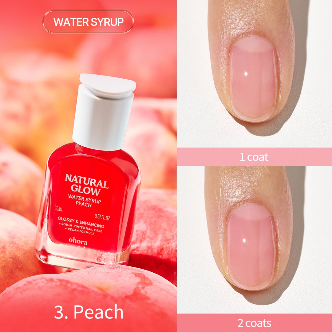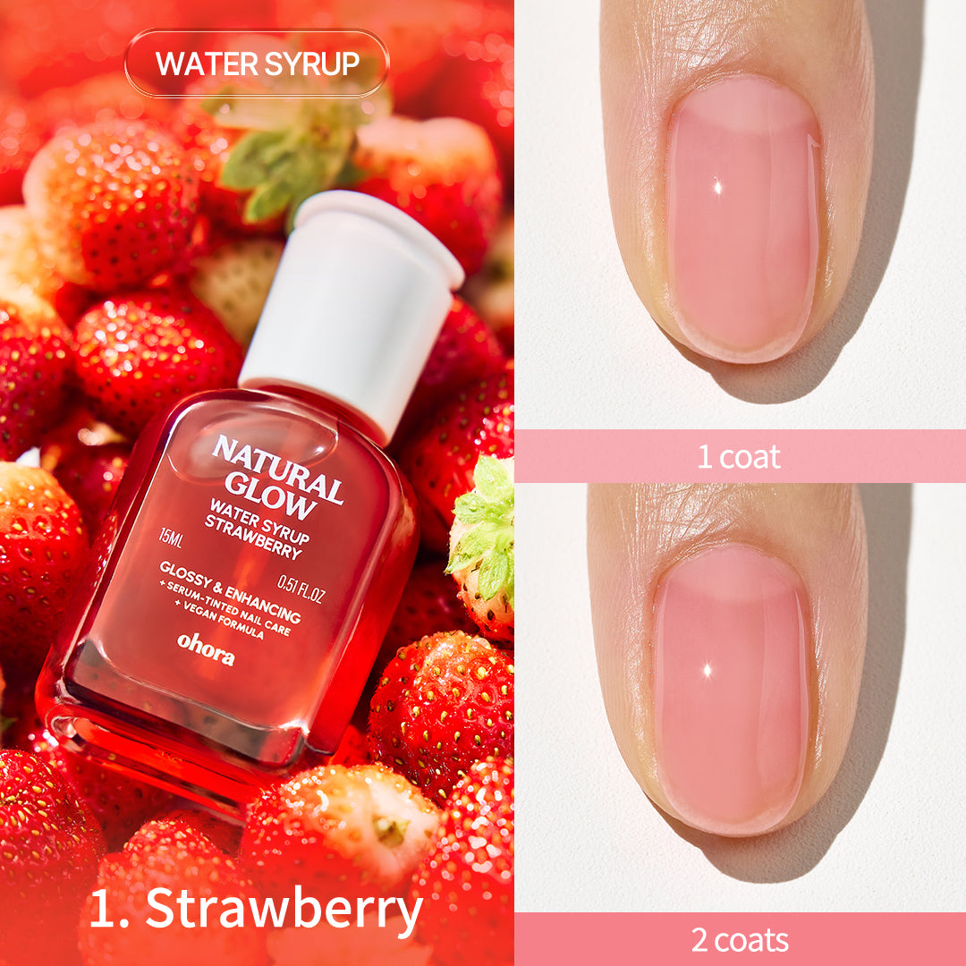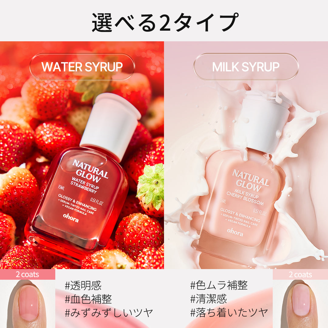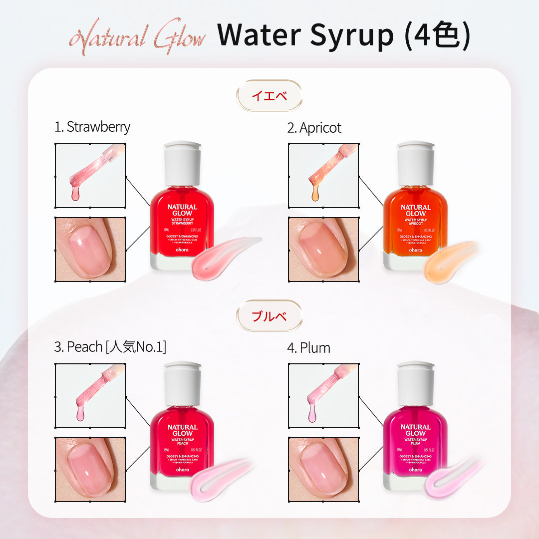 ・ウォーターシロップタイプ(4種):爪に自然な彩りを与えながら、うるおいをしっかりと補給。爪を美しく見せたいけれど、よりさりげない発色がお好みの方におすすめです。