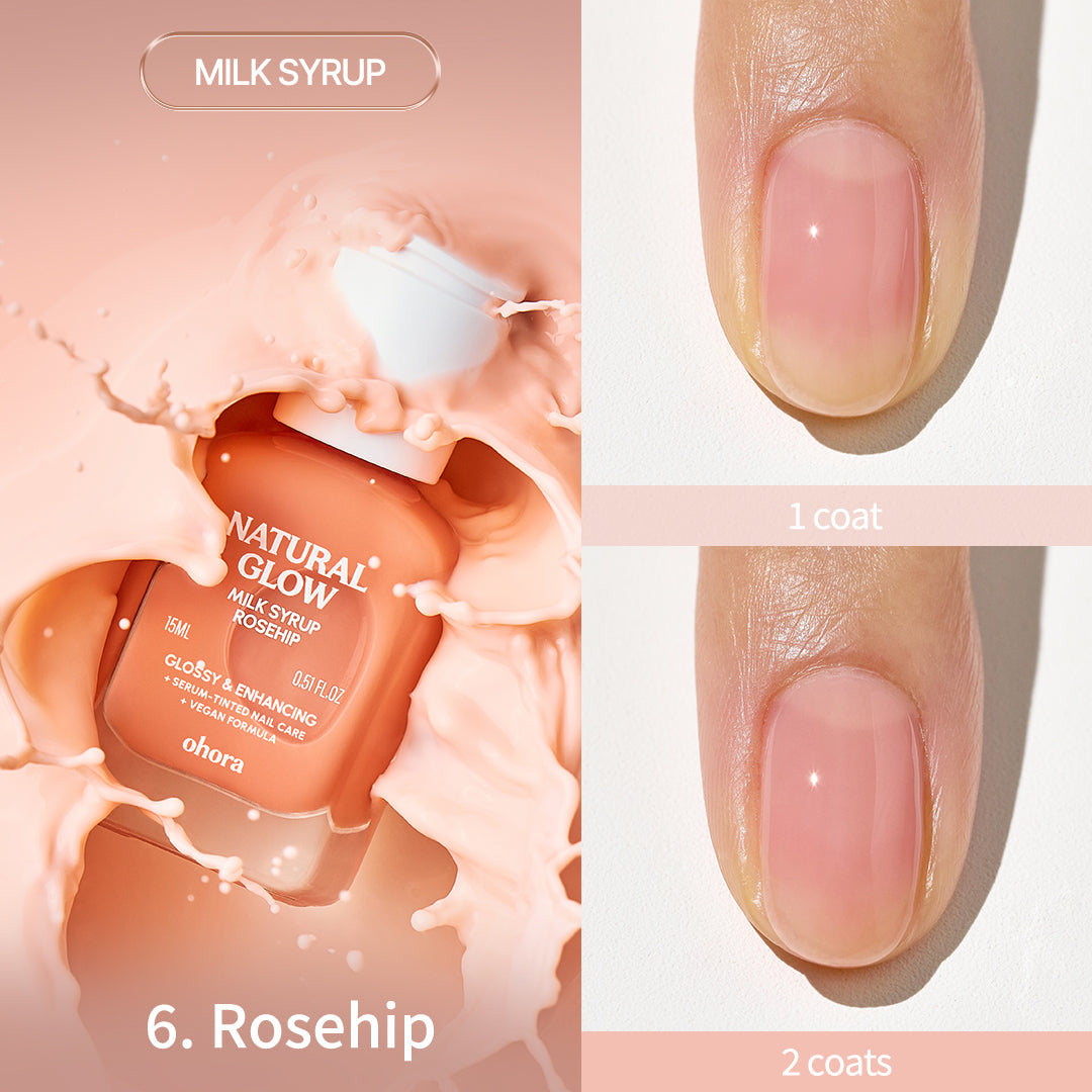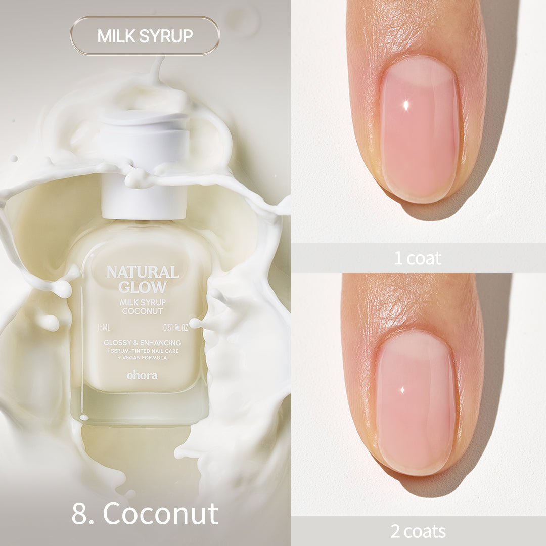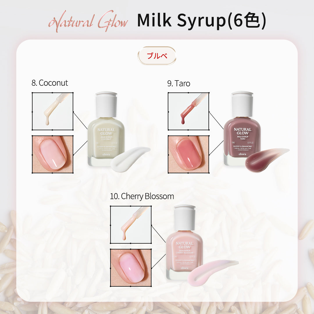 ・ミルクシロップタイプ(6種):爪の自然なトーン補正とカバー力がありながら、うるおいをしっかりと補給。爪のカバー力も求めたい方、優しくトーンアップした仕上がりがお好みの方におすすめです。
