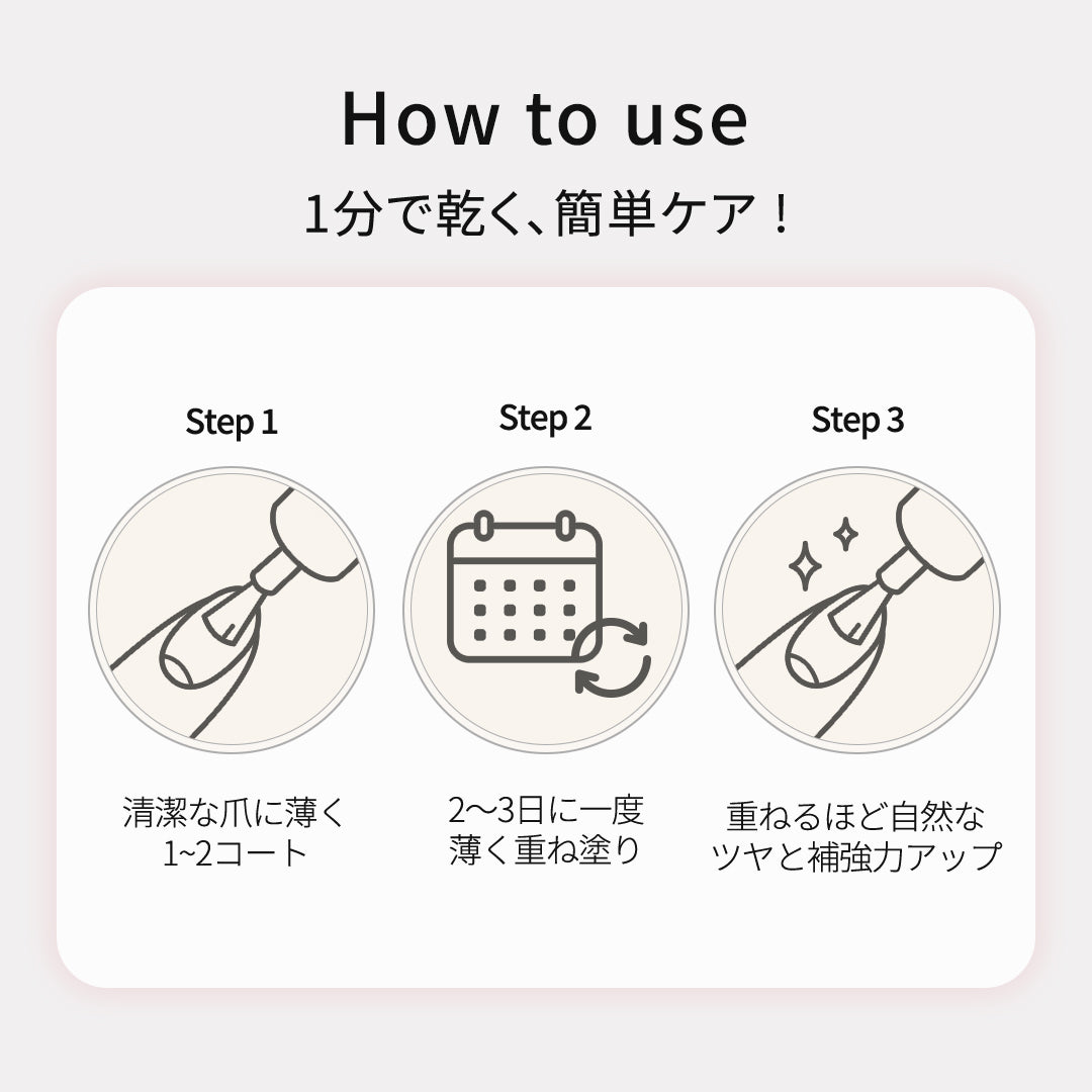 ・トップジェルを重ねて塗ると、ネイルがはがれにくくなり、自然なツヤもプラスされます。