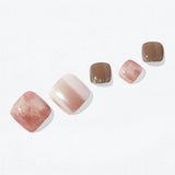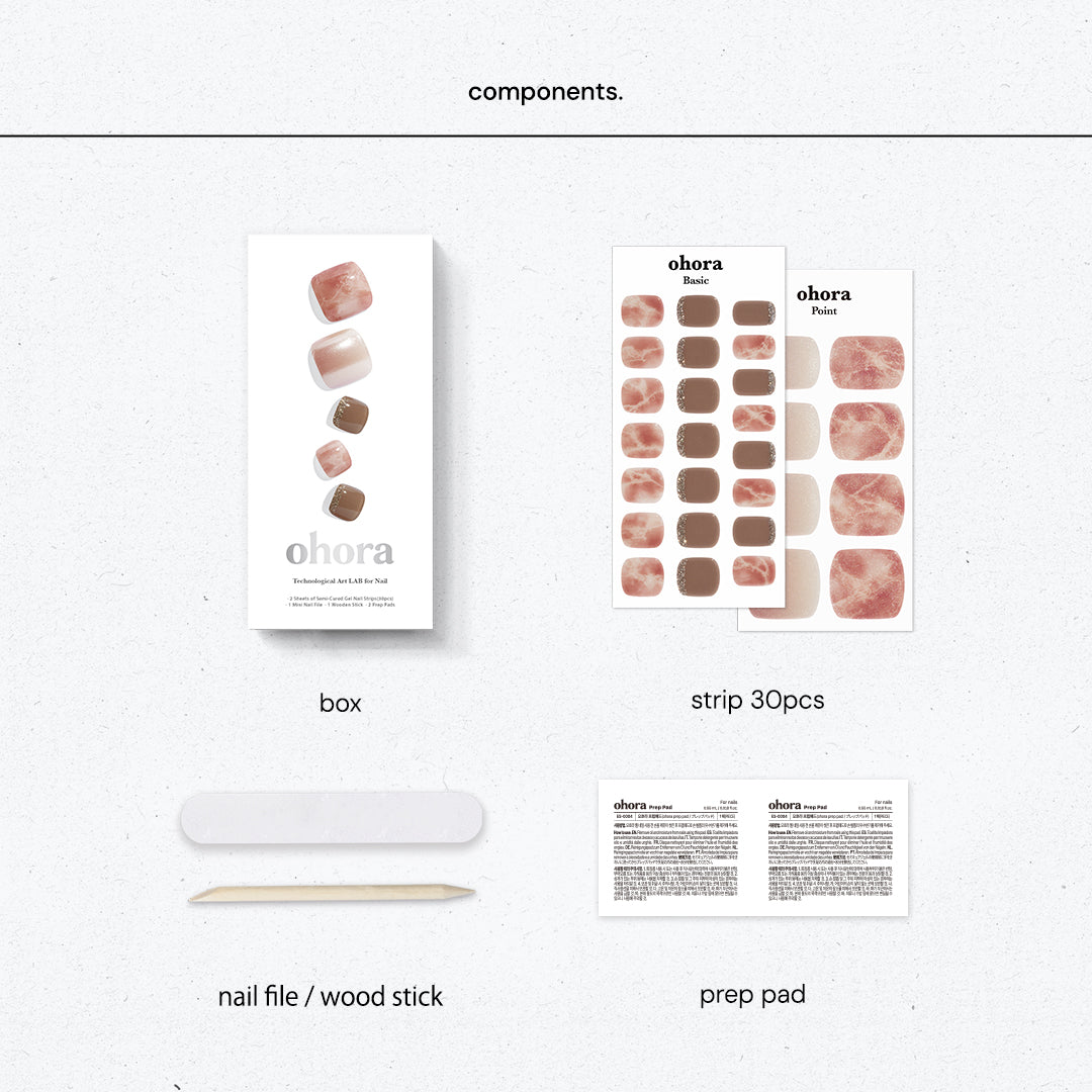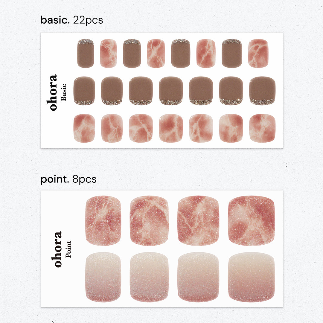 天然石の質感をナチュラル&ロマンティックに表現。ツヤ感のあるテクスチャーにピンクのマーブル模様を重ね、ホワイトのマーメイドパウダーをまとわせることで、内側から輝くようなグロウ効果を生み出しています。ゴールドグリッターを添え、エレガントなペディスタイルが日常を華やかに彩ります。