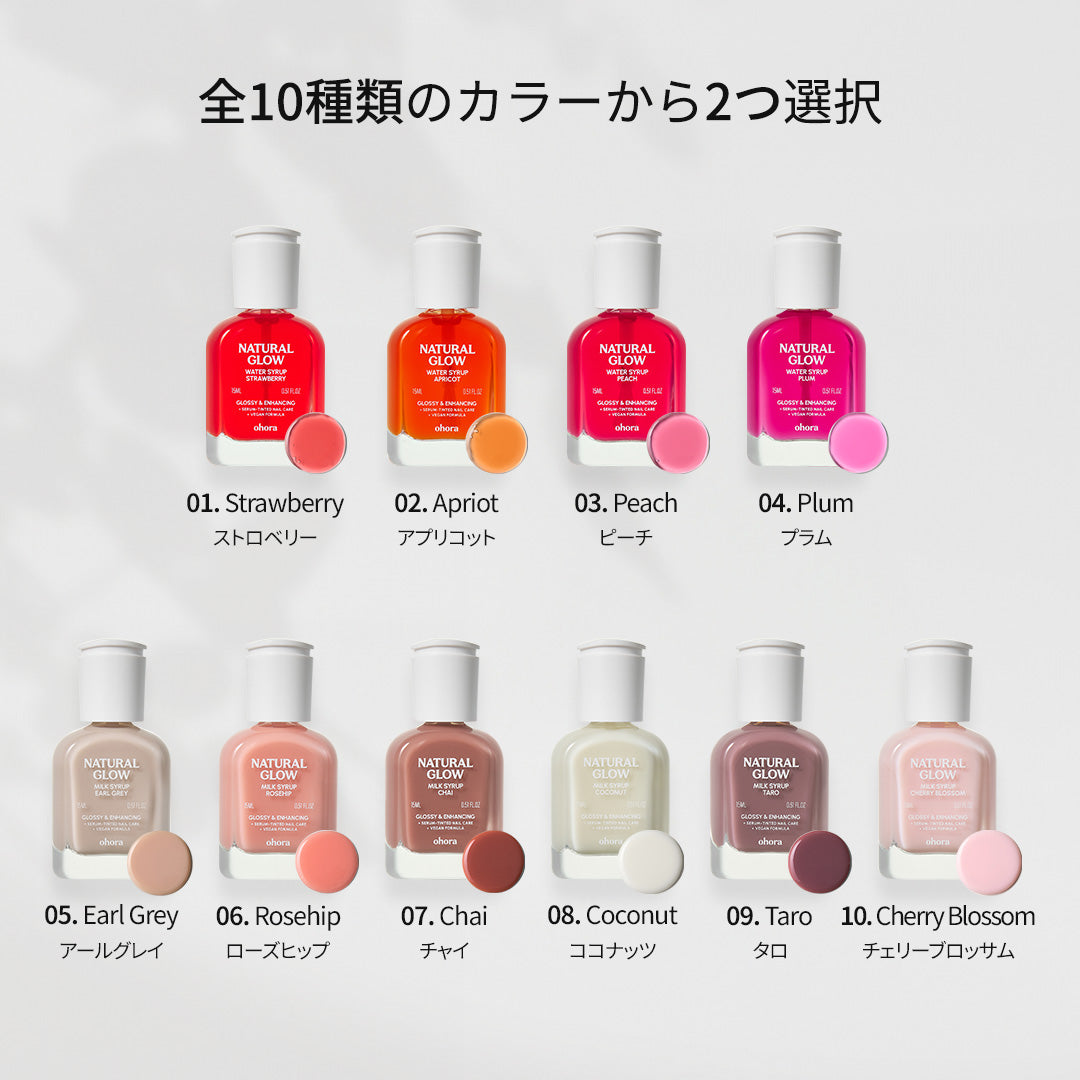 ・ミルクシロップタイプ(6種):爪の自然なトーン補正とカバー力がありながら、うるおいをしっかりと補給。爪のカバー力も求めたい方、優しくトーンアップした仕上がりがお好みの方におすすめです。
